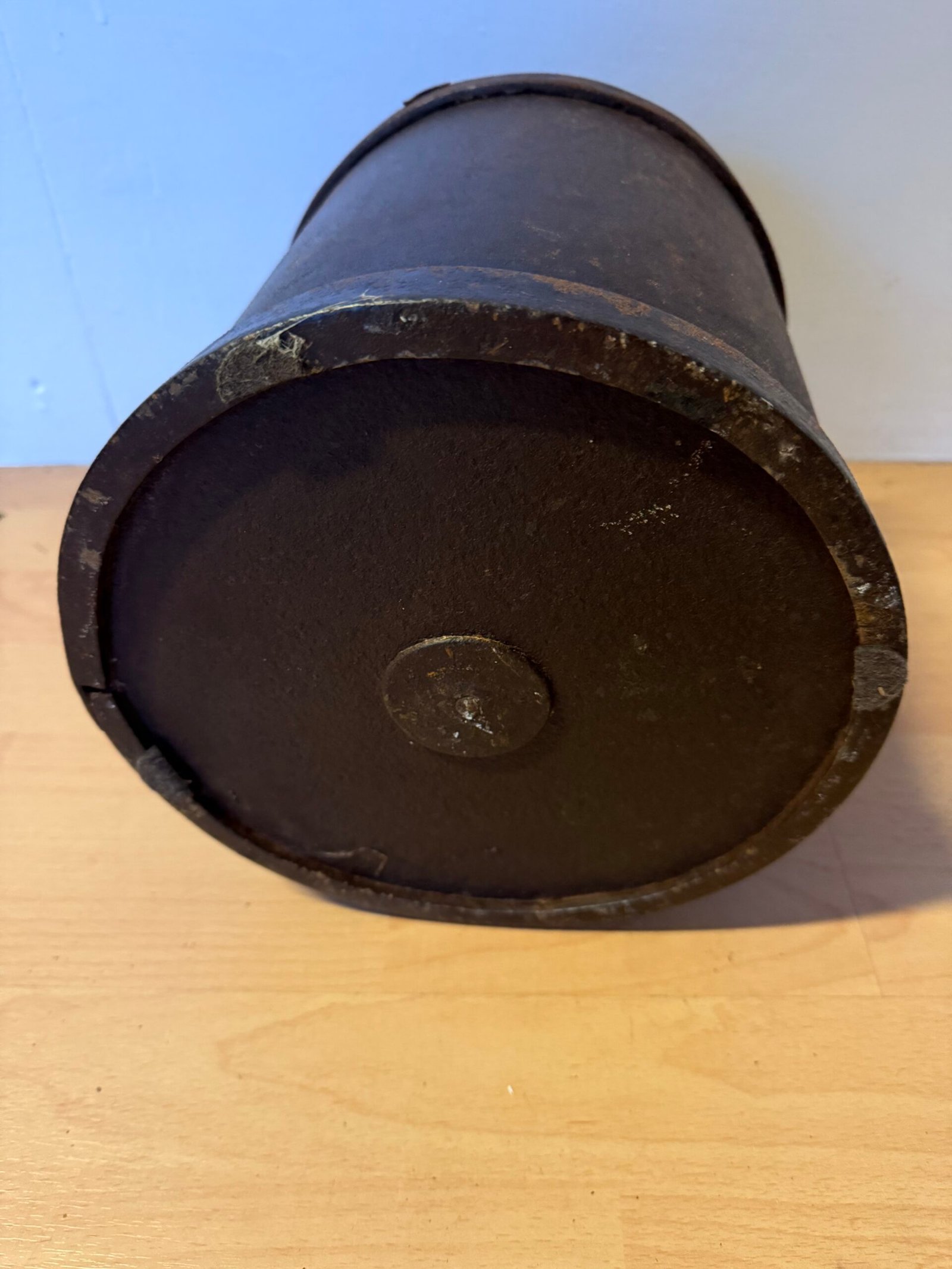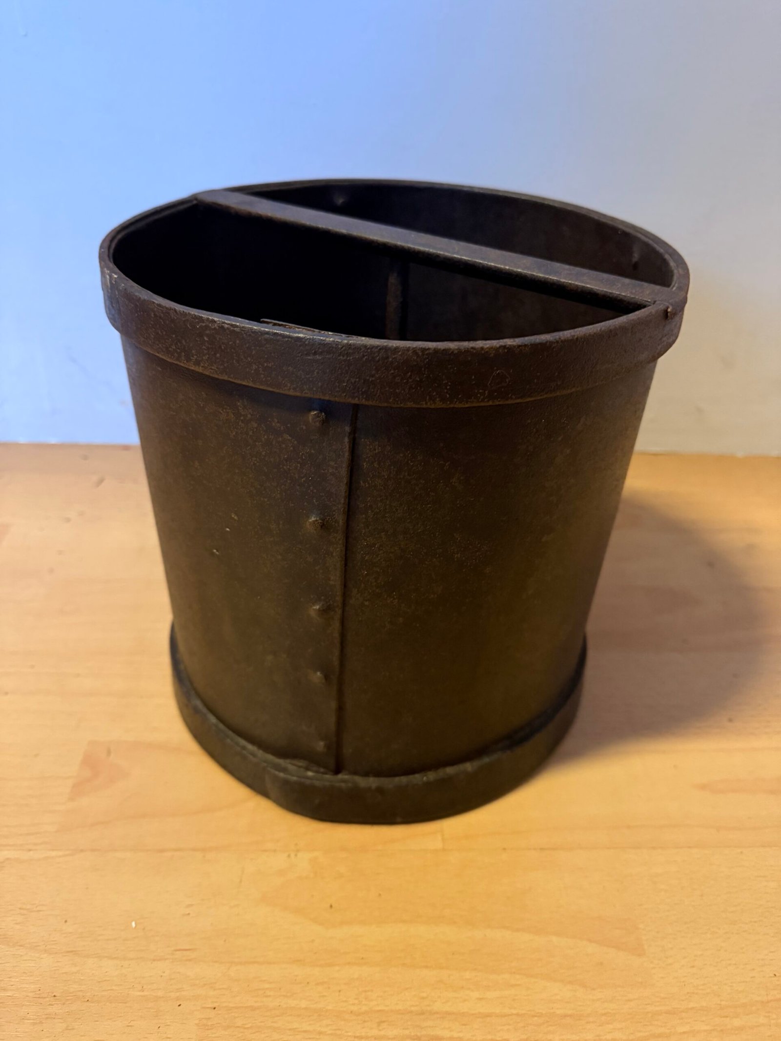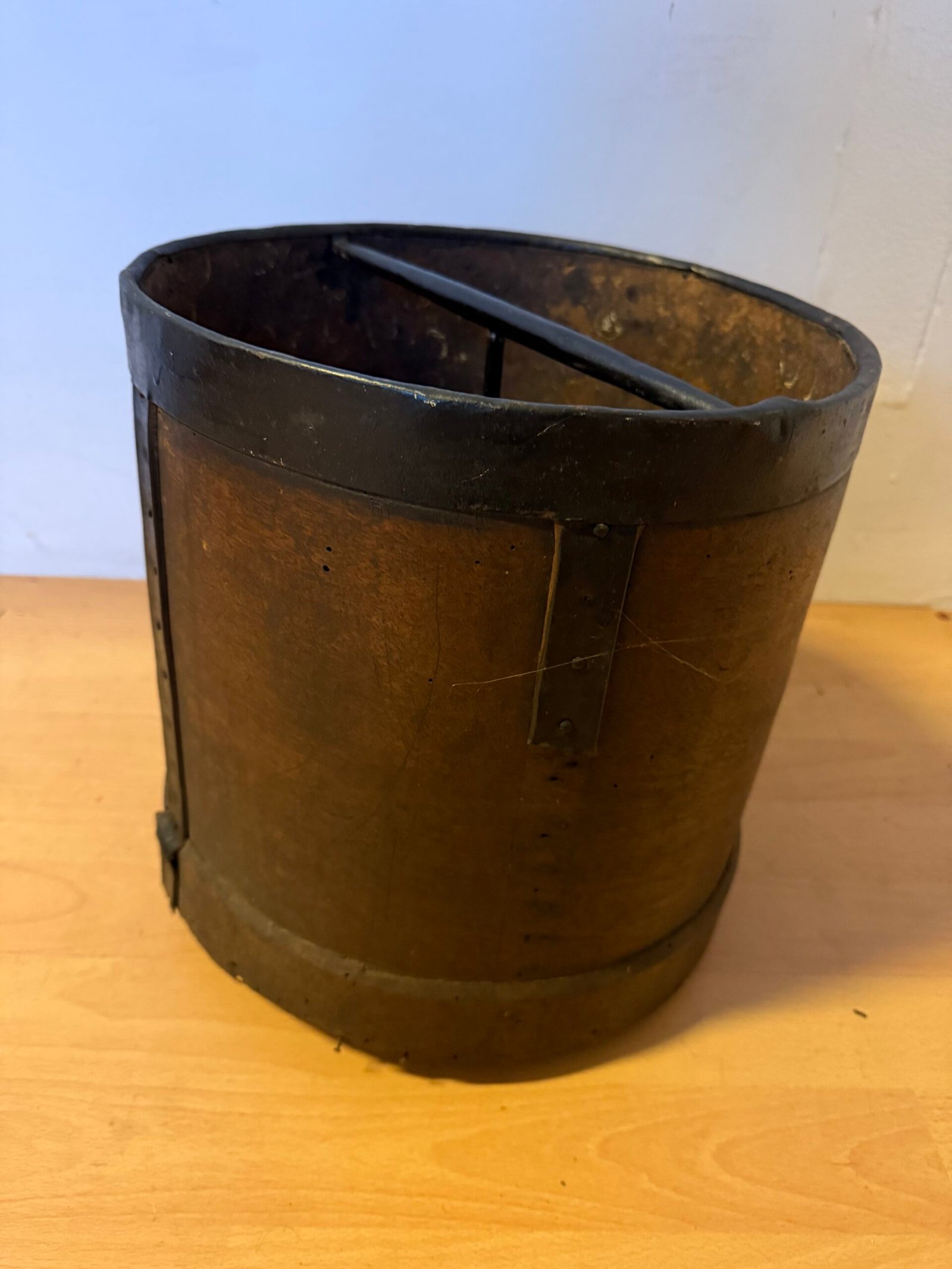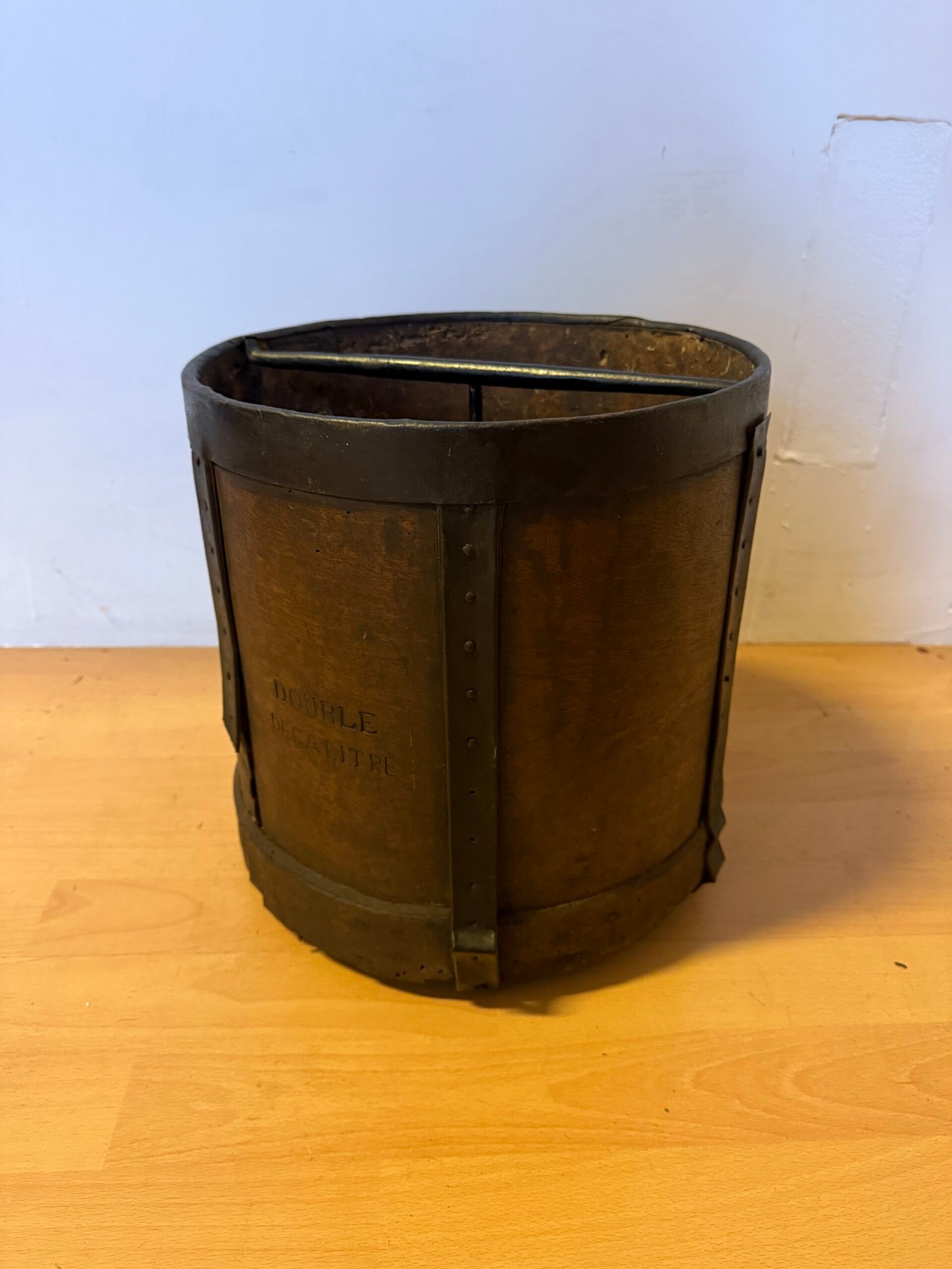 Affascinante e autentico misurino in legno, un pezzo di storia rurale ideale per gli amanti degli oggetti d’epoca. Questo contenitore, di forma leggermente ovale o cilindrica, è costruito con doghe di legno tenute insieme da robuste fasce in ferro che ne garantiscono la solidità e la durabilità. Le bande metalliche, chiodate, conferiscono un aspetto rustico e vissuto. Sul lato, sono visibili delle incisioni («DOUBLE» e un’altra parola meno leggibile, forse «MEASURE»), che indicano la sua probabile funzione come misurino di capacità per prodotti agricoli come grano o farina. Perfetto come elemento decorativo in un ambiente rustico, una cucina di campagna o una taverna, può anche essere utilizzato come portavasi insolito o contenitore per oggetti