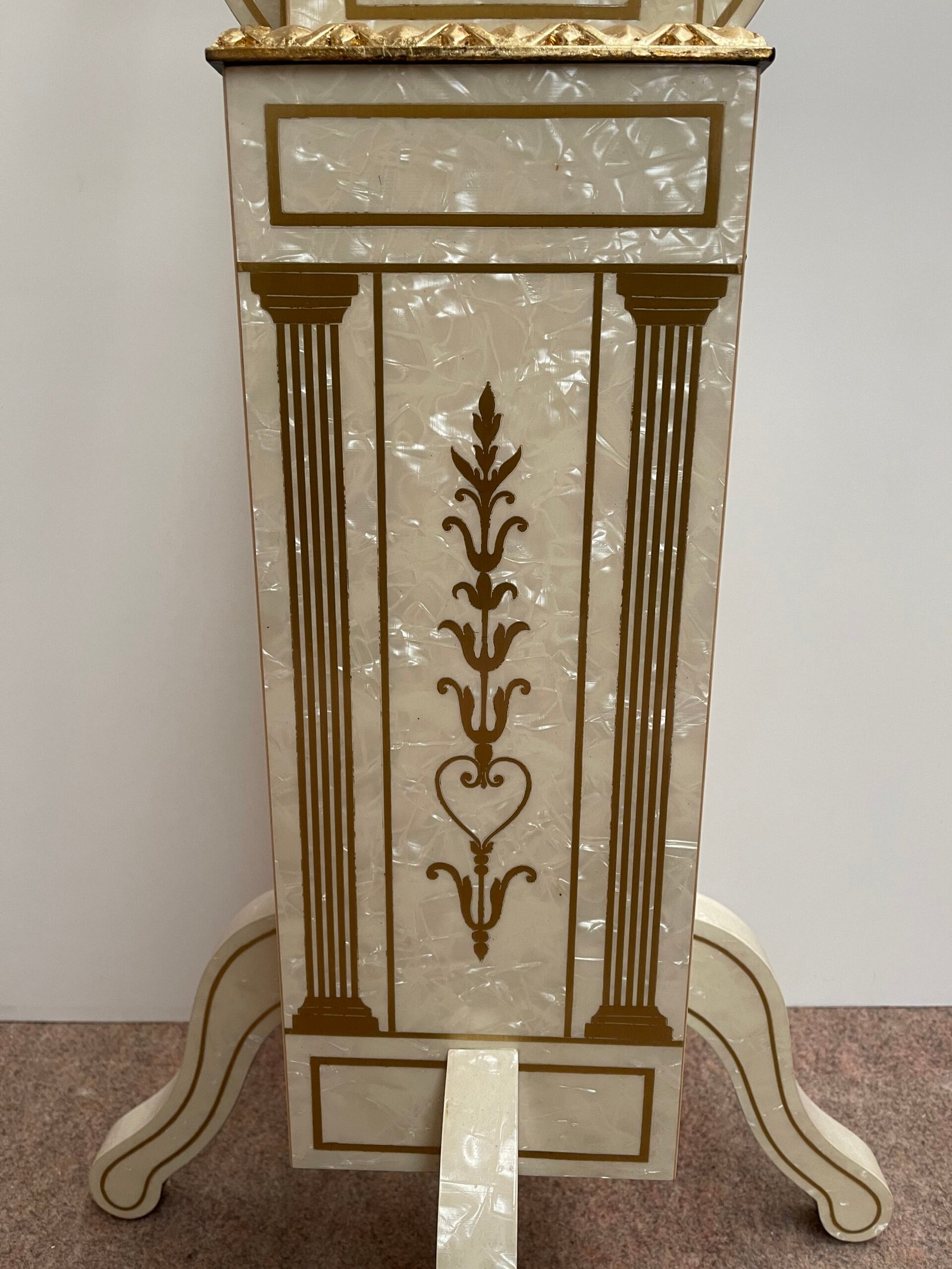 • Struttura in legno con elegante finitura bianco avorio e intarsi dorati, che decorano i pannelli laterali e la base.
