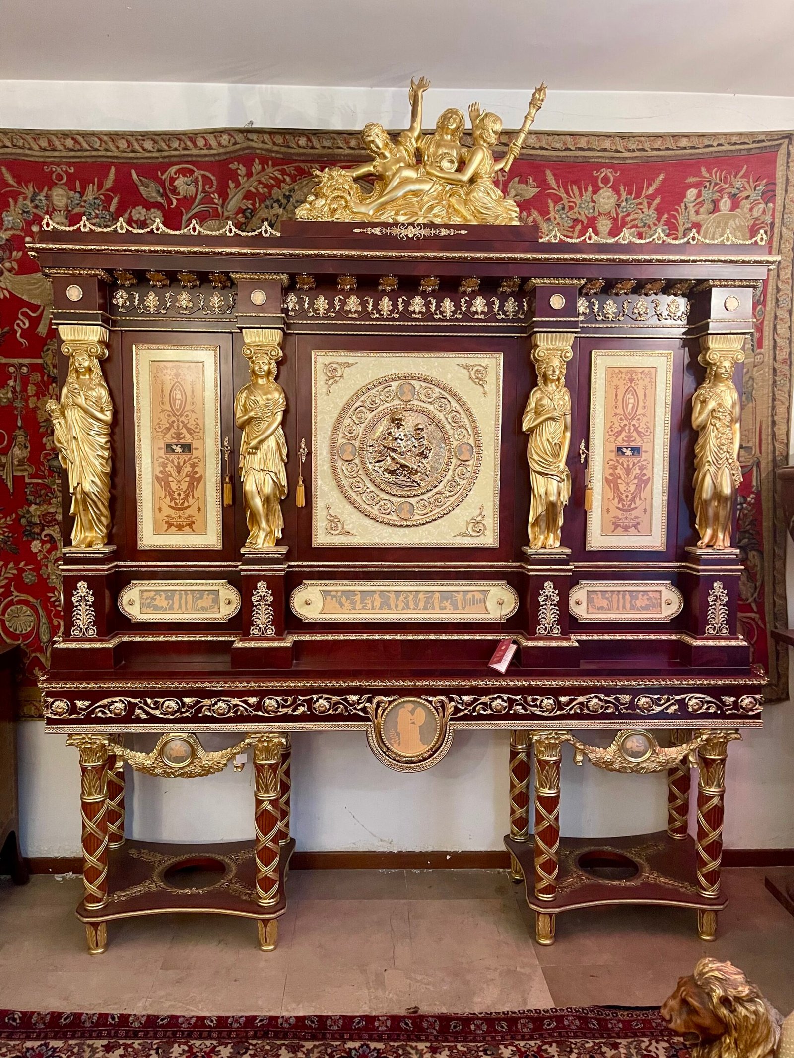La struttura del mobile è in legno massello, arricchita da decorazioni dorate, intagli finemente lavorati e dettagli raffinati che richiamano il gusto rococò della corte francese. Le pannellature delle porte e dei cassetti sono adornate da motivi floreali e geometrici, tipici del periodo, mentre le colonne scolpite in stile classico e i dettagli dorati aggiungono un ulteriore tocco di maestosità.