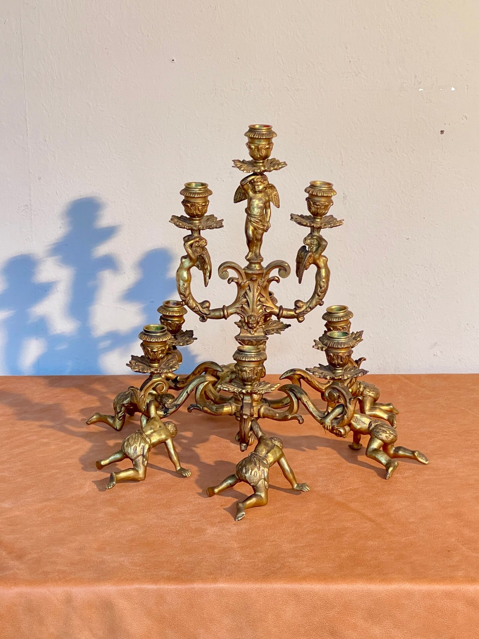 Magnifico candelabro d’epoca in bronzo dorato, finemente cesellato, presenta una struttura riccamente decorata e sostenuta da quattro putti scolpiti, raffigurati in pose dinamiche e piene di movimento. L’opera culmina in una raffinata composizione centrale con ulteriori figure alate che sorreggono i portacandele superiori.