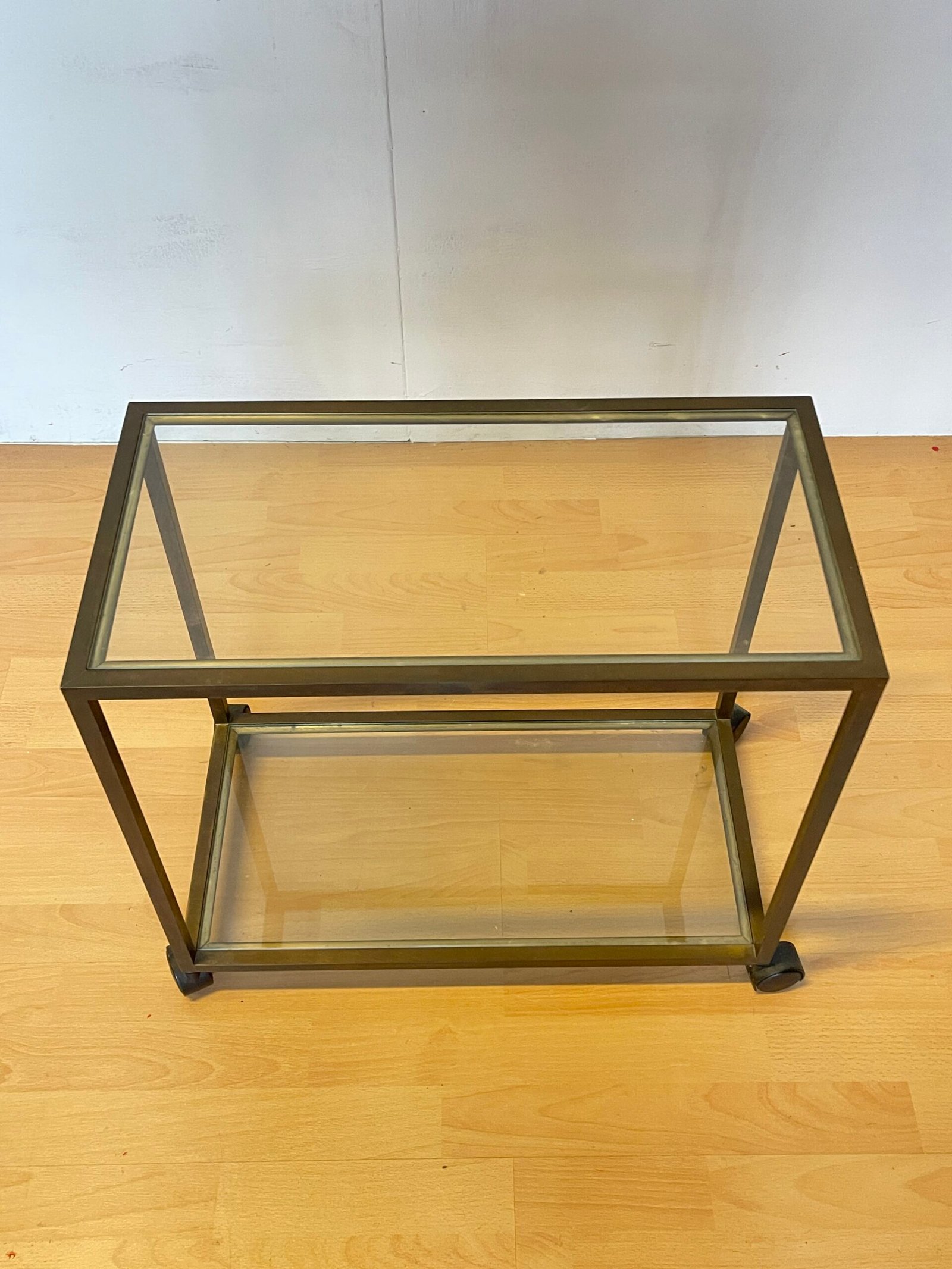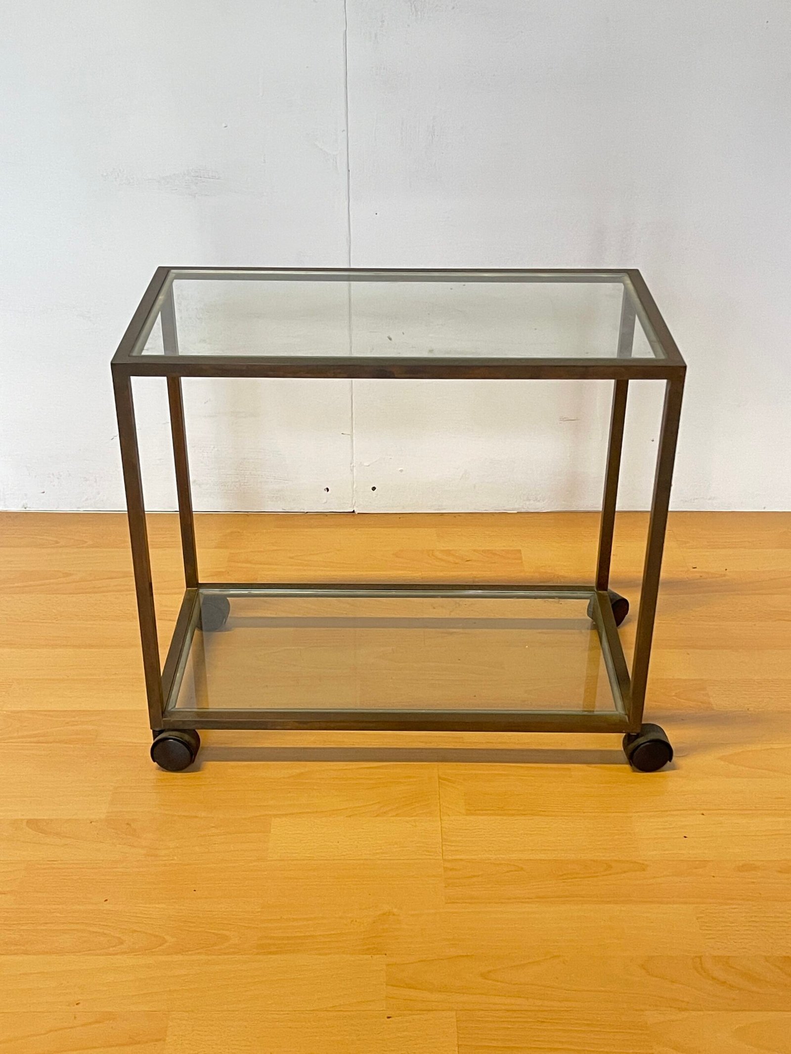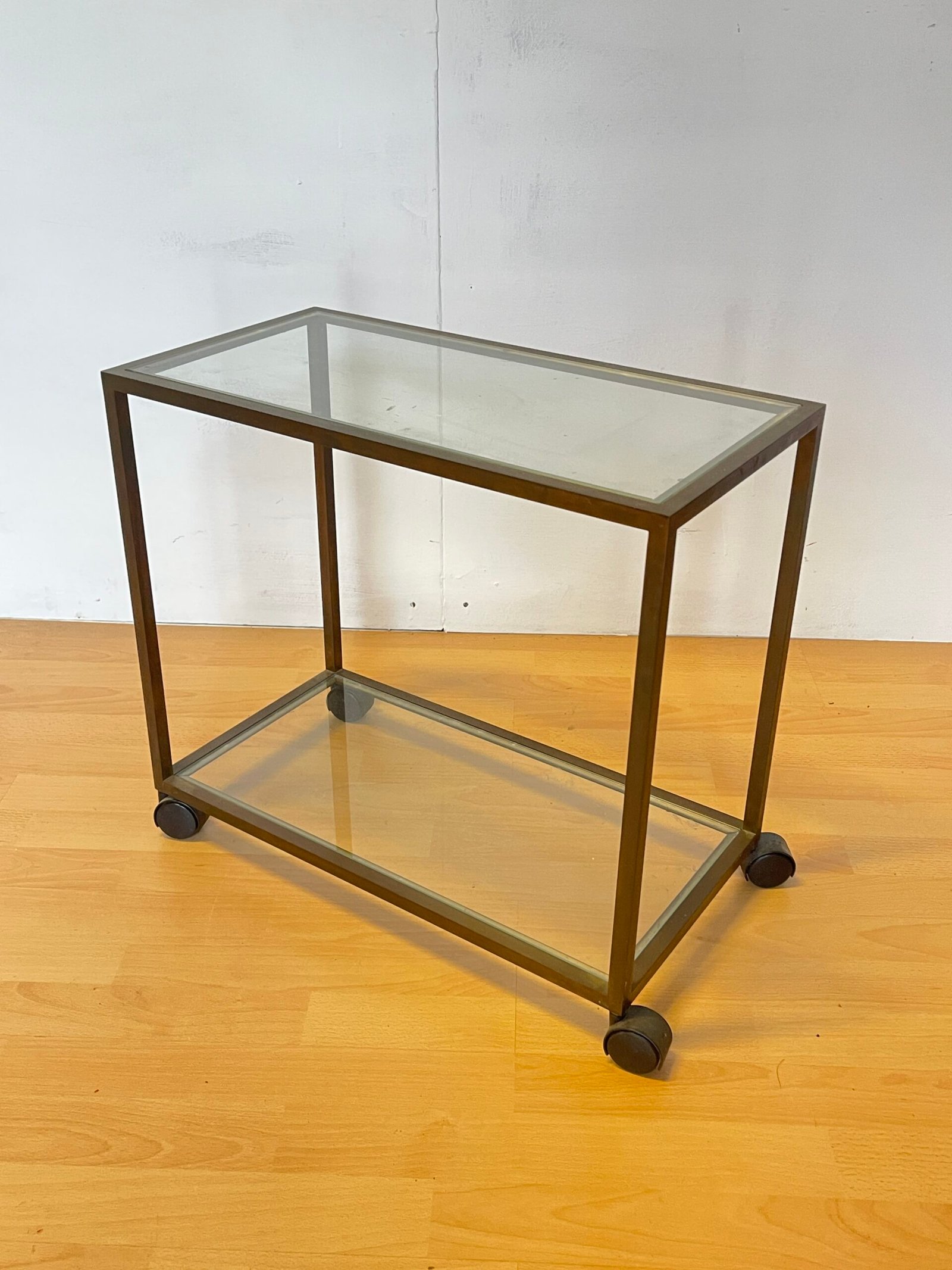 carrellino a due ripiani. La struttura in metallo color bronzo anticato si abbina perfettamente ai piani in vetro trasparente, creando un look leggero ma solido. Dotato di pratiche ruote nere, è facile da spostare e perfetto come tavolino da soggiorno, carrello bar, o mobile multiuso in cucina o studio.
