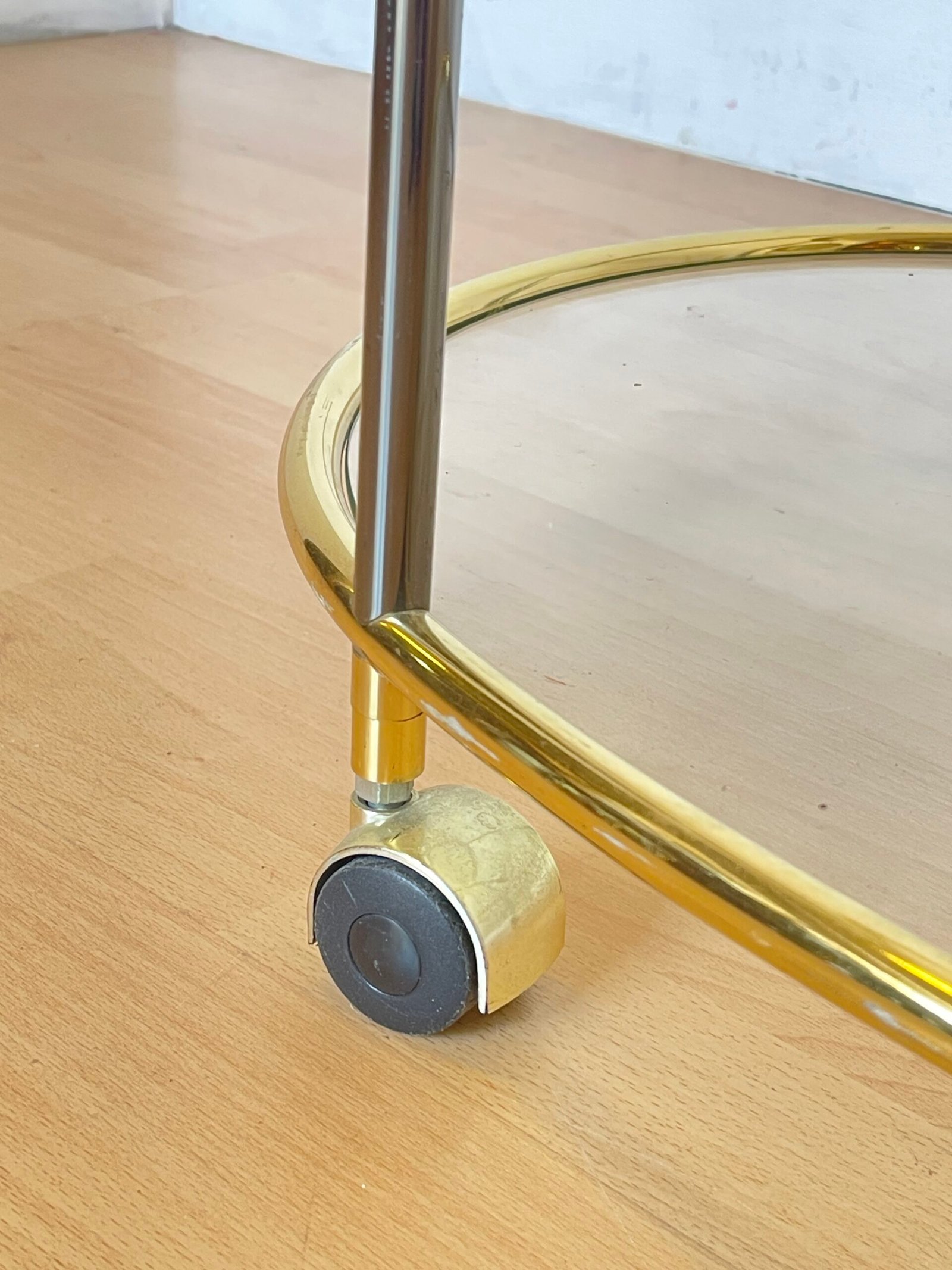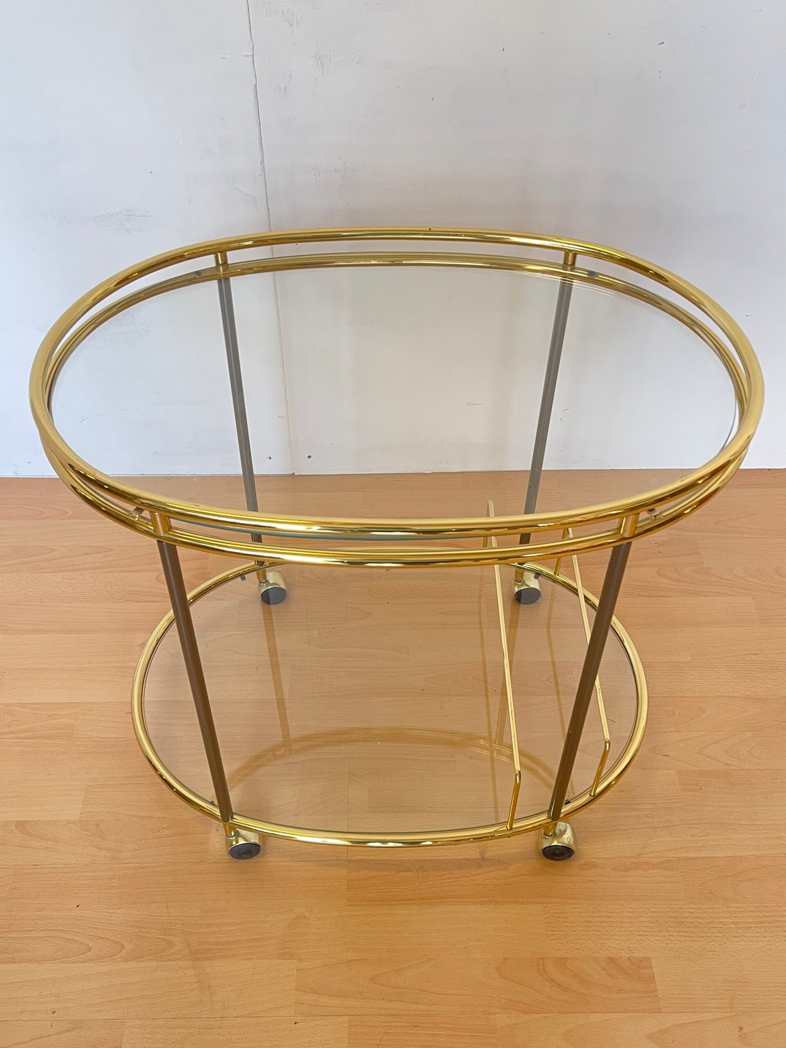 Raffinato e funzionale, questo carrello bar in stile Mid-Century è un vero gioiello d’arredo. La struttura ovale in ottone dorato abbraccia due ripiani in vetro trasparente, offrendo spazio e luminosità. Le linee essenziali si uniscono a dettagli curati come il portabottiglie integrato e le ruote perfettamente funzionanti, per un tocco retrò senza tempo. Perfetto per creare un angolo cocktail chic o arricchire il soggiorno con stile e personalità.