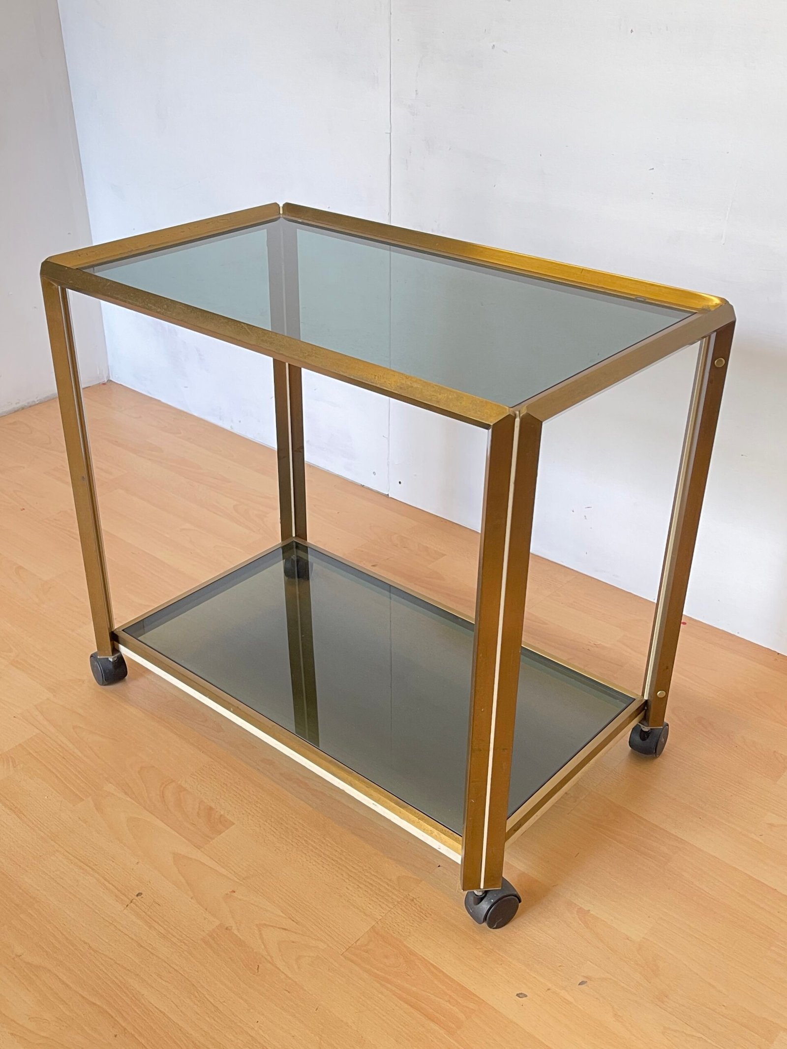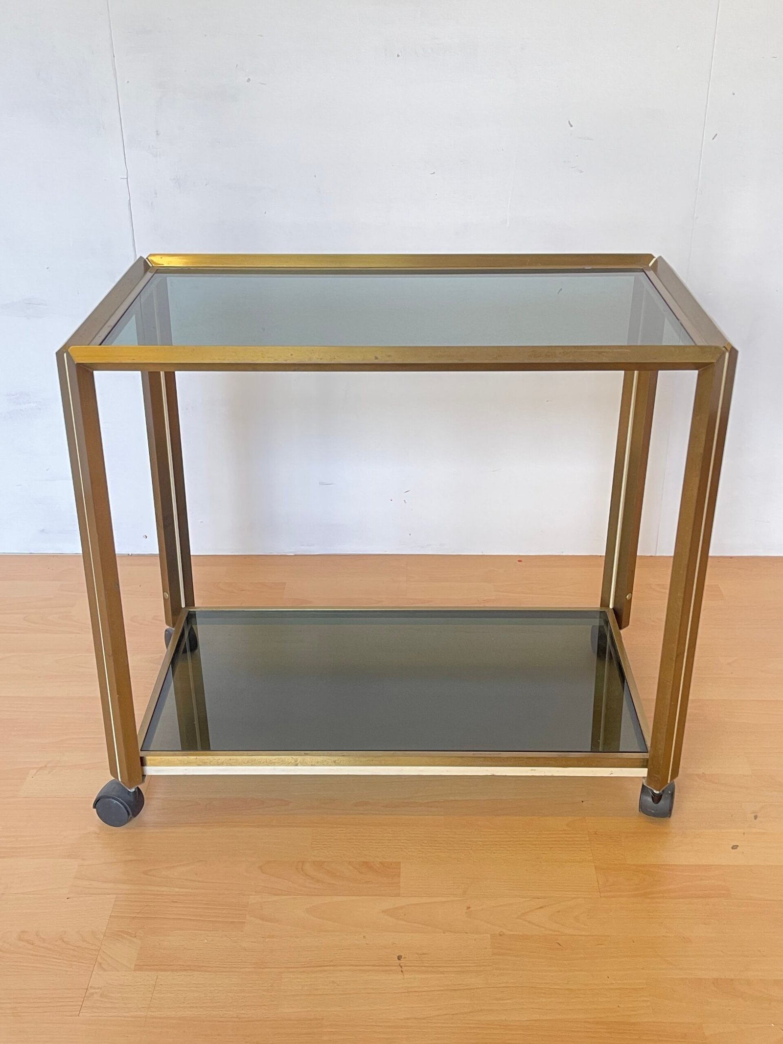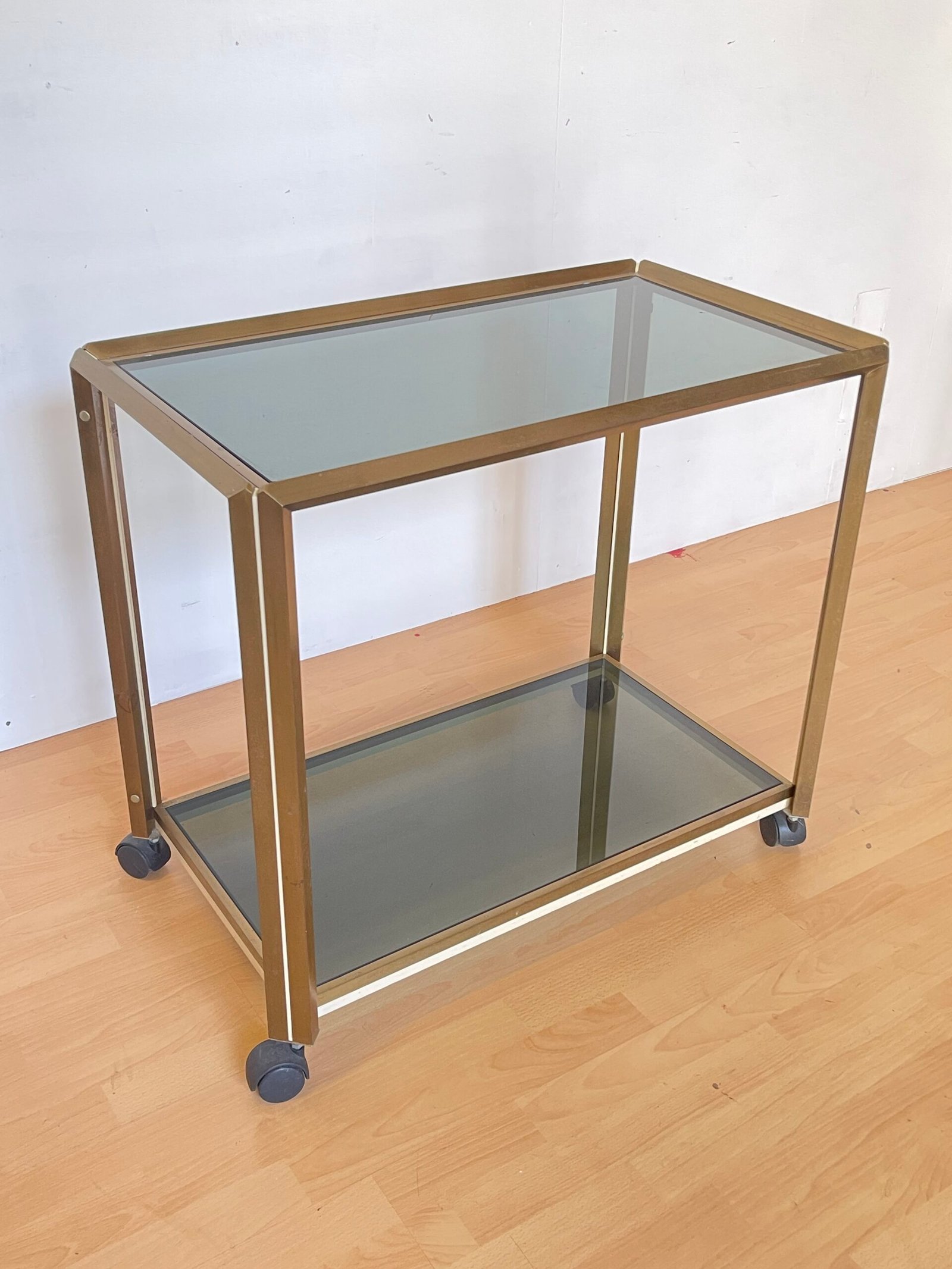 Elegante carrello bar dal design raffinato, perfetto per aggiungere un tocco di classe al tuo salotto o sala da pranzo. La struttura in metallo color ottone con finitura dorata e i ripiani in vetro fumé donano un aspetto sofisticato e senza tempo. Dotato di pratiche ruote per spostarlo facilmente, è ideale per servire drink, esporre bottiglie o utilizzarlo come tavolino d’appoggio.