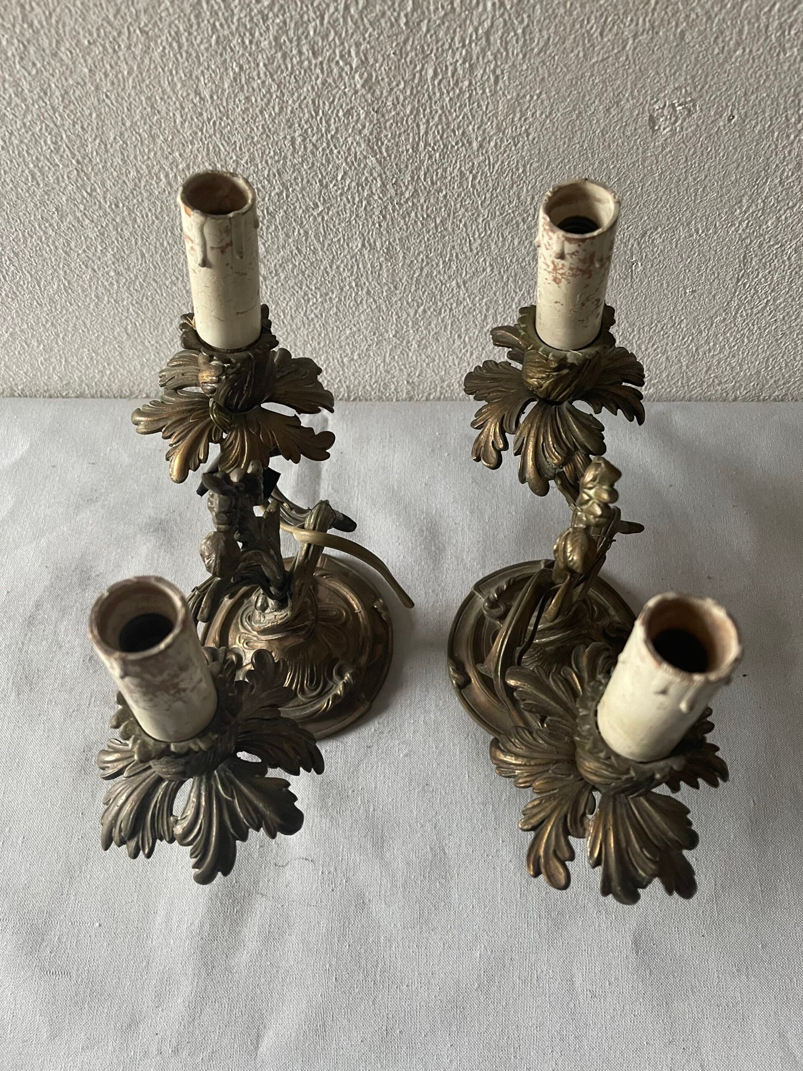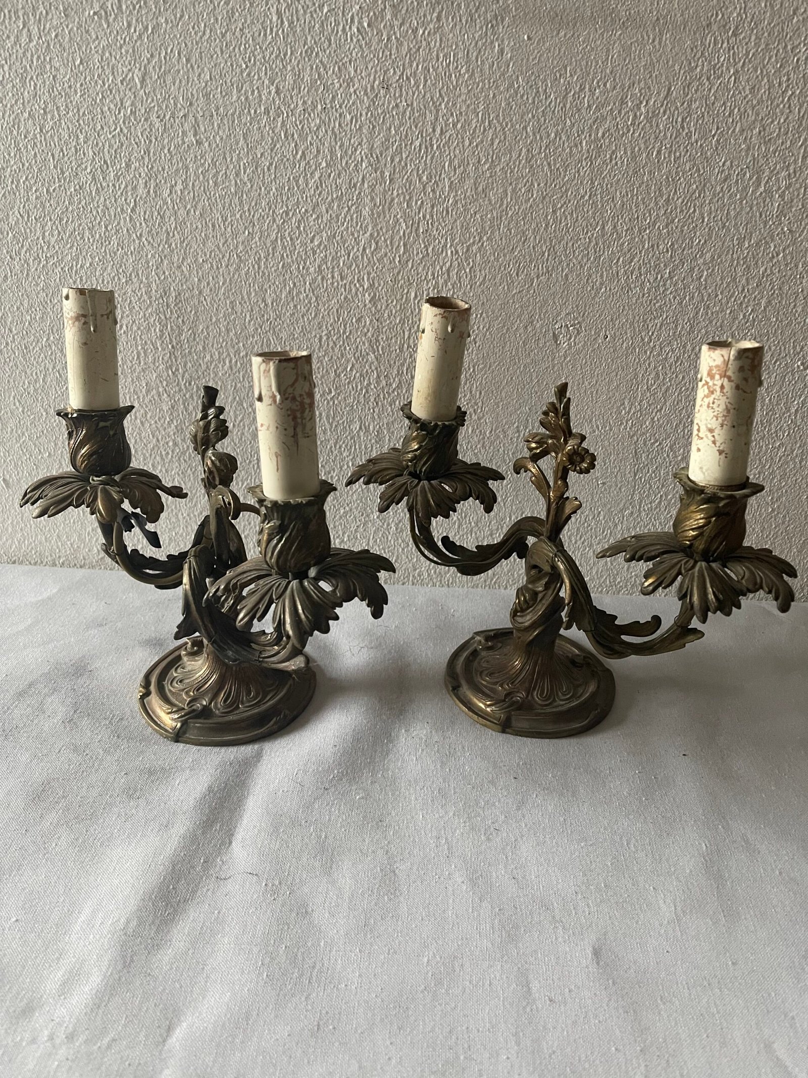 Eleva l’atmosfera del tuo spazio con questa squisita coppia di candelabri, un vero tributo all’arte decorativa d’altri tempi. Realizzati in bronzo o ottone con una patina invecchiata che ne esalta la profondità, questi pezzi presentano una base solida da cui si ergono sinuosi fusti decorati con un ricco motivo a foglie stilizzate, che richiamano la flora ornamentale del periodo barocco. Ogni candelabro è concepito per ospitare due punti luce (o candele), simulando un’illuminazione soffusa e classica, perfetta per creare un’atmosfera intima e raffinata. La minuziosa lavorazione dei dettagli e la composizione equilibrata conferiscono a questi oggetti un’eleganza senza tempo, ideali per adornare camini, credenze o tavoli importanti
