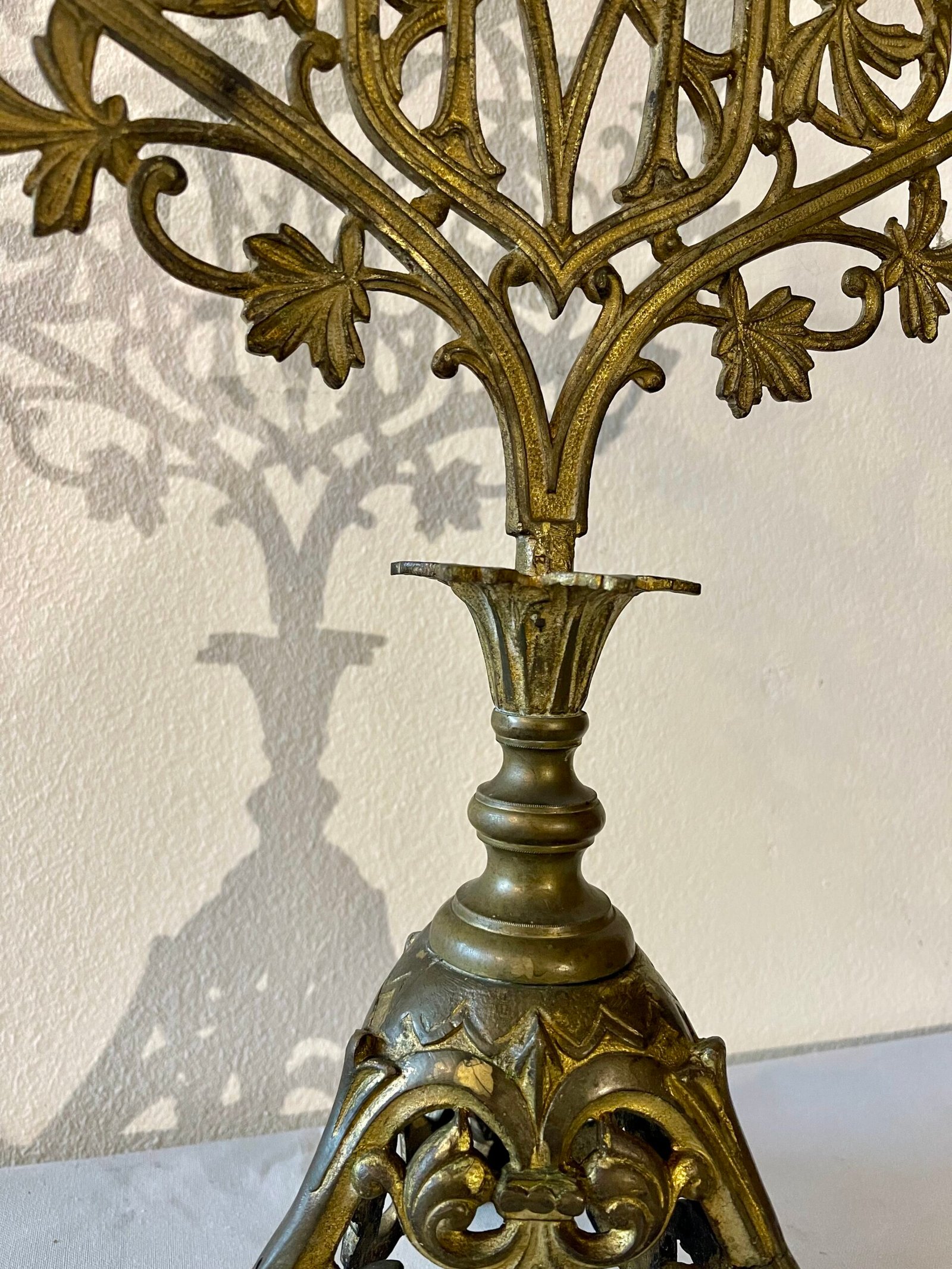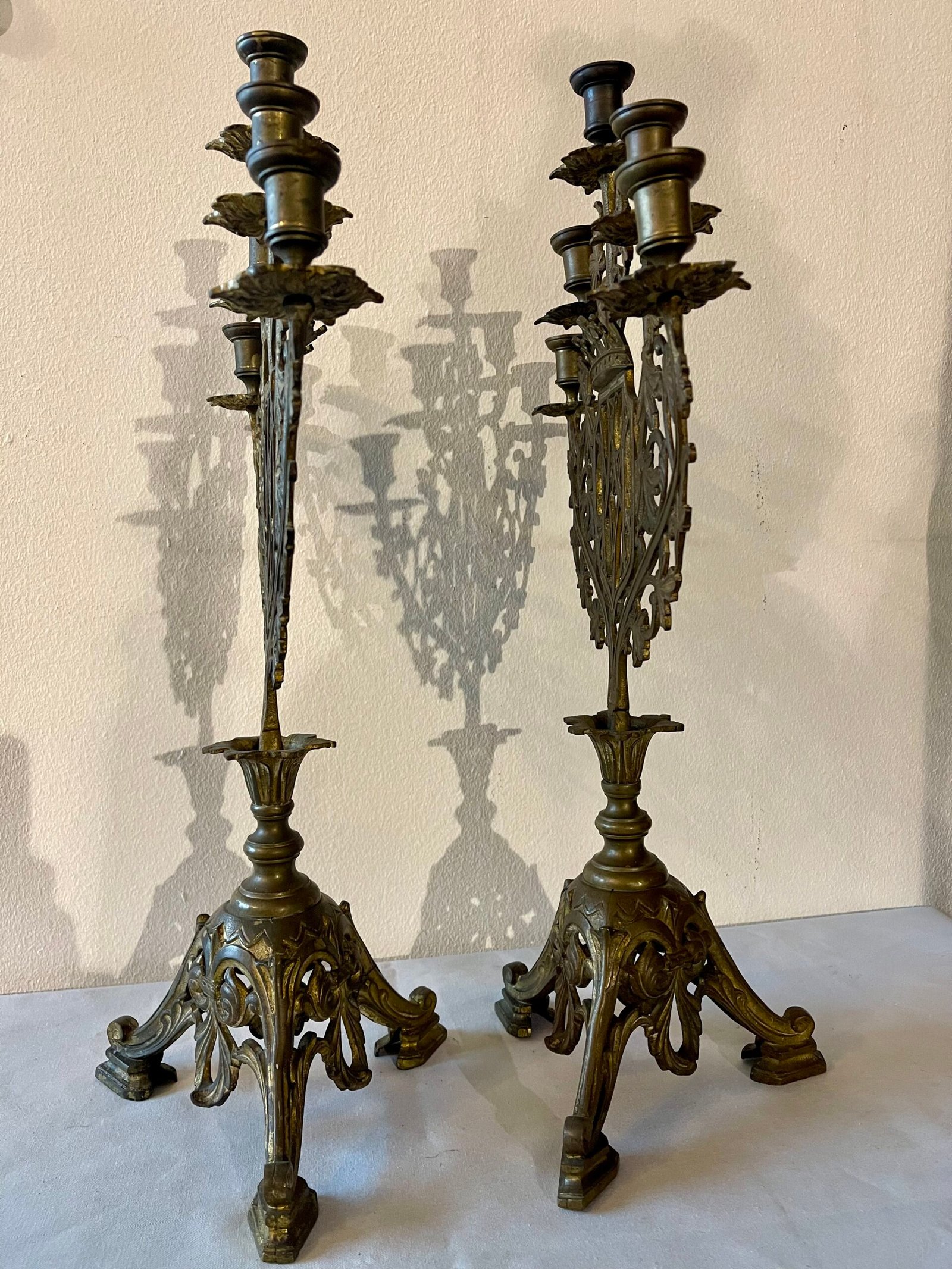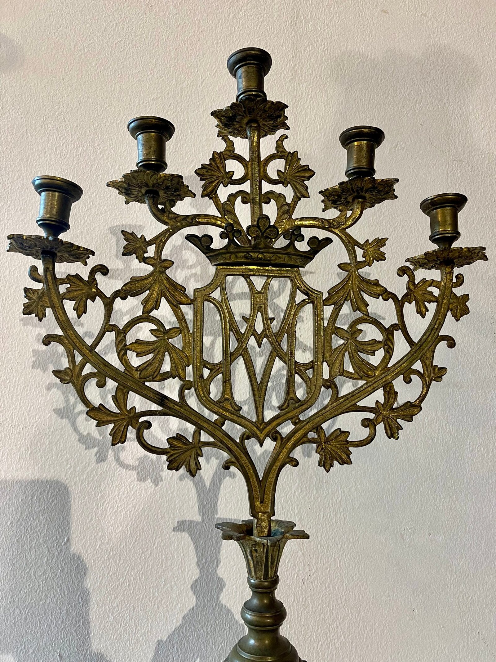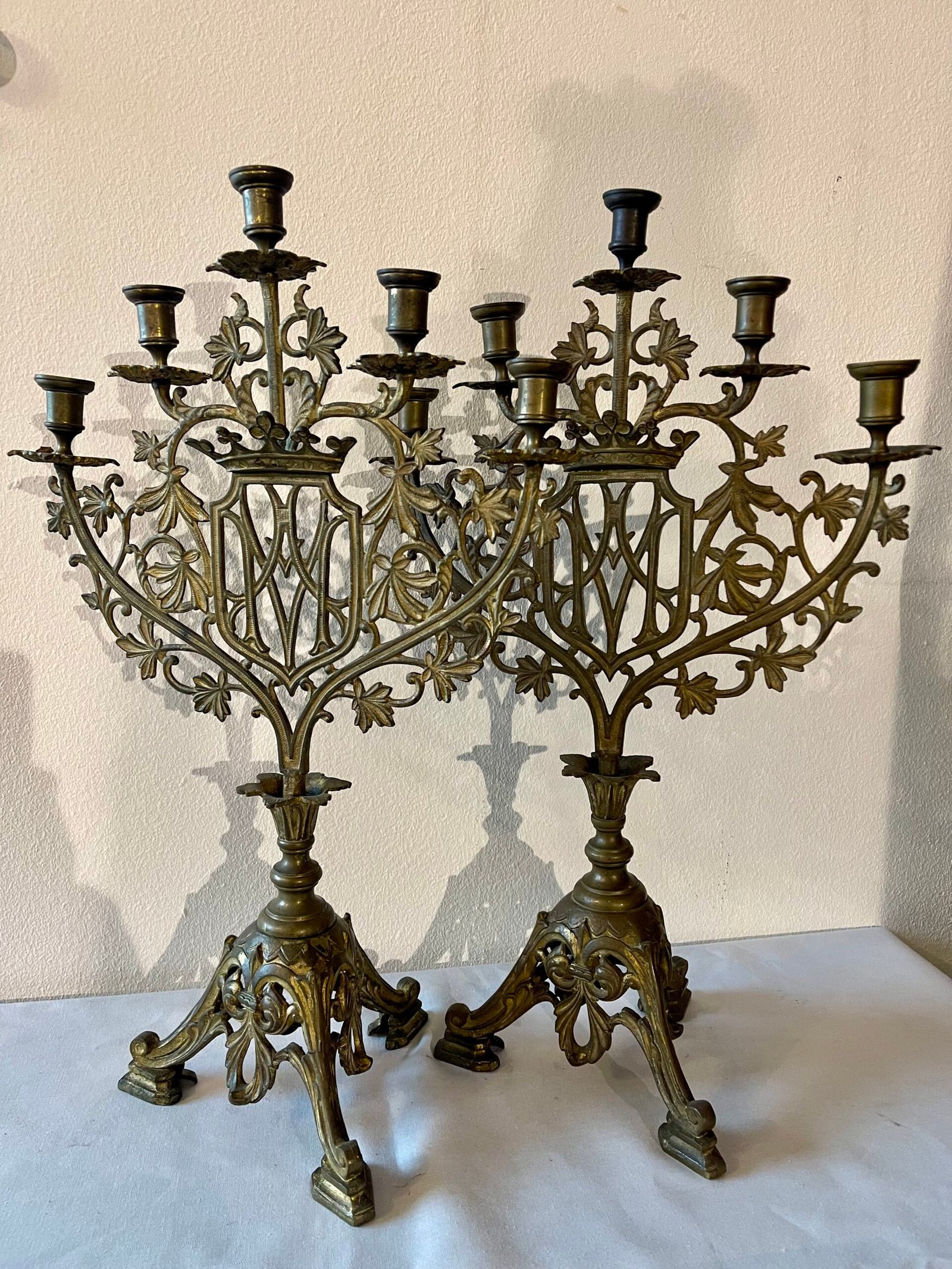Si tratta di una coppia di imponenti candelabri a sette bracci, ciascuno progettato per sostenere sette candele. Il design è fortemente ispirato allo stile gotico, con una ricca decorazione a traforo che include elementi floreali stilizzati (come foglie di vite o edera) e motivi architettonici. La parte centrale presenta uno scudo o un cartiglio vuoto, che potrebbe essere stato destinato a un monogramma o uno stemma. La struttura è complessa e ramificata, con i bracci che si estendono elegantemente per sorreggere i portacandele. La base è robusta e anch’essa decorata con volute e elementi che richiamano lo stesso stile goticheggiante, garantendo stabilità. Il metallo, probabilmente bronzo o ottone, presenta una finitura anticata o una patina che ne accentua il carattere storico e la profondità dei dettagli. Questi candelabri sono pezzi decorativi di grande effetto, adatti ad ambienti classici o con un’atmosfera più ricercata e storica