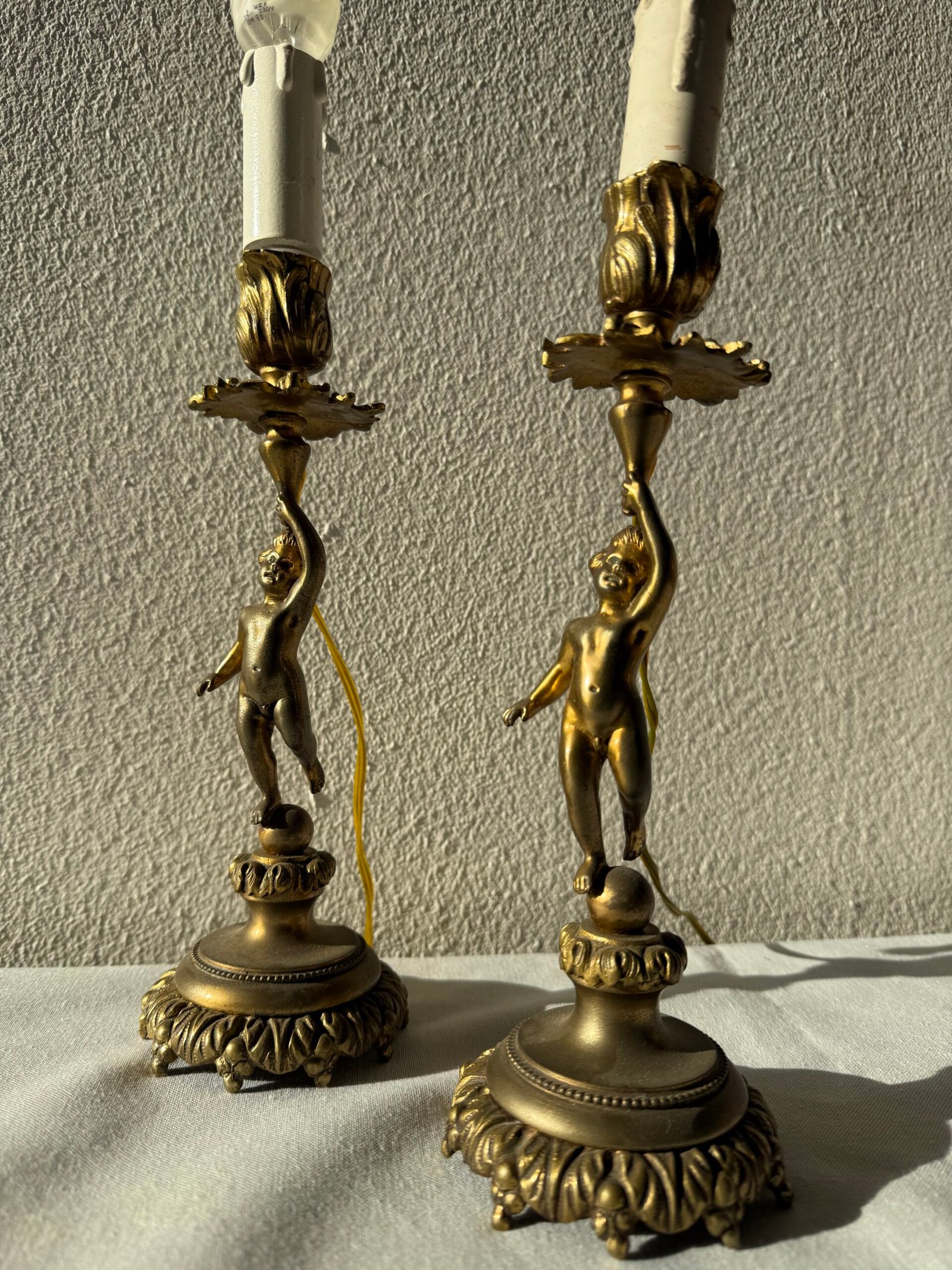 Questa è una deliziosa coppia di lampade da tavolo, ciascuna con un design elaborato e dettagliato. Ogni lampada presenta una base circolare scolpita con motivi a foglie e volute, tipici dello stile Barocco o Rococò. Da questa base si erge un fusto, che incorpora la figura di un putto o angelo, elegantemente scolpito in bronzo (o ottone con finitura dorata), che sembra sorreggere la parte superiore della lampada. La parte superiore è anch’essa finemente lavorata, con elementi decorativi che richiamano candelabri. Sopra di essi, un portalampada a forma di candela bianca ospita una lampadina a fiamma, che imita l’effetto di una vera candela. Il cablaggio è visibile, il che suggerisce che siano state convertite da candelieri o create per l’illuminazione elettrica con un’estetica antica. Sono pezzi decorativi che aggiungono un tocco di eleganza classica e calore a qualsiasi ambiente