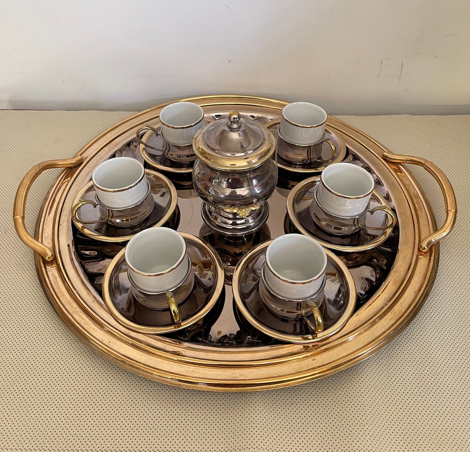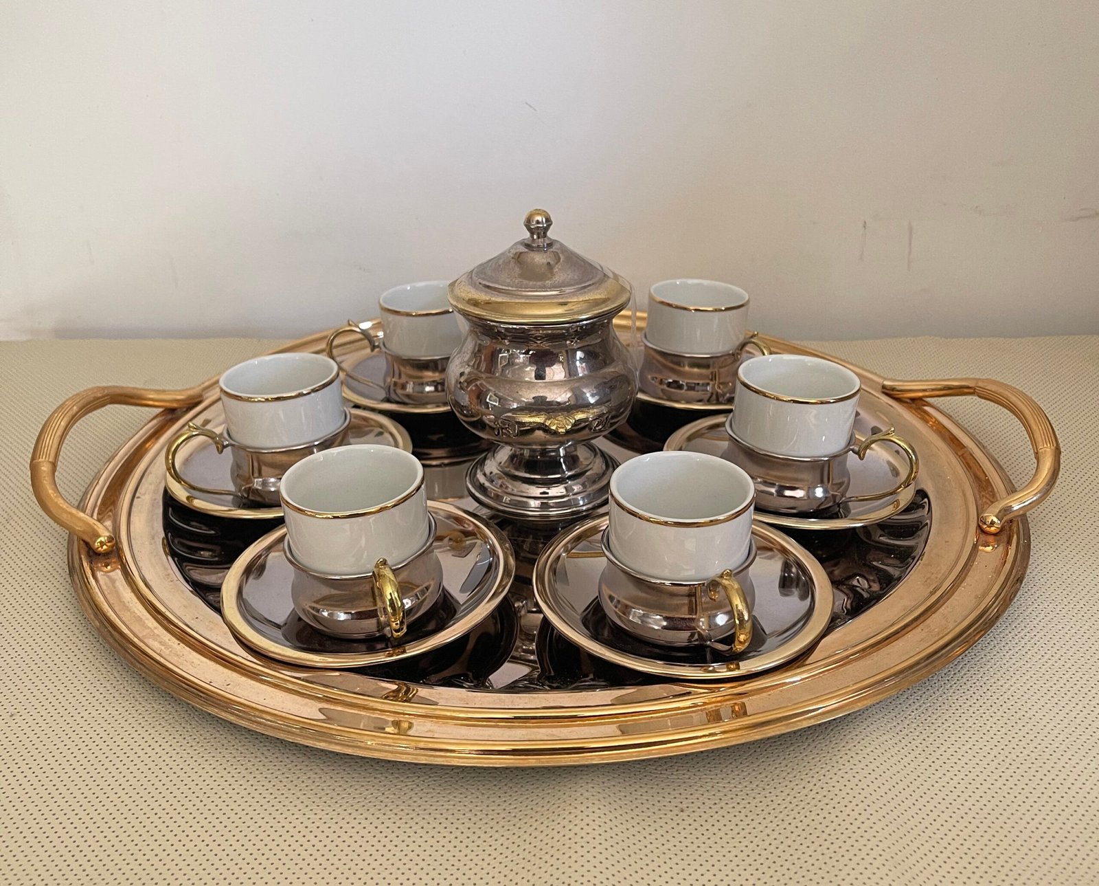 Elegante servizio da caffè in porcellana e metallo argentato – completo di vassoio