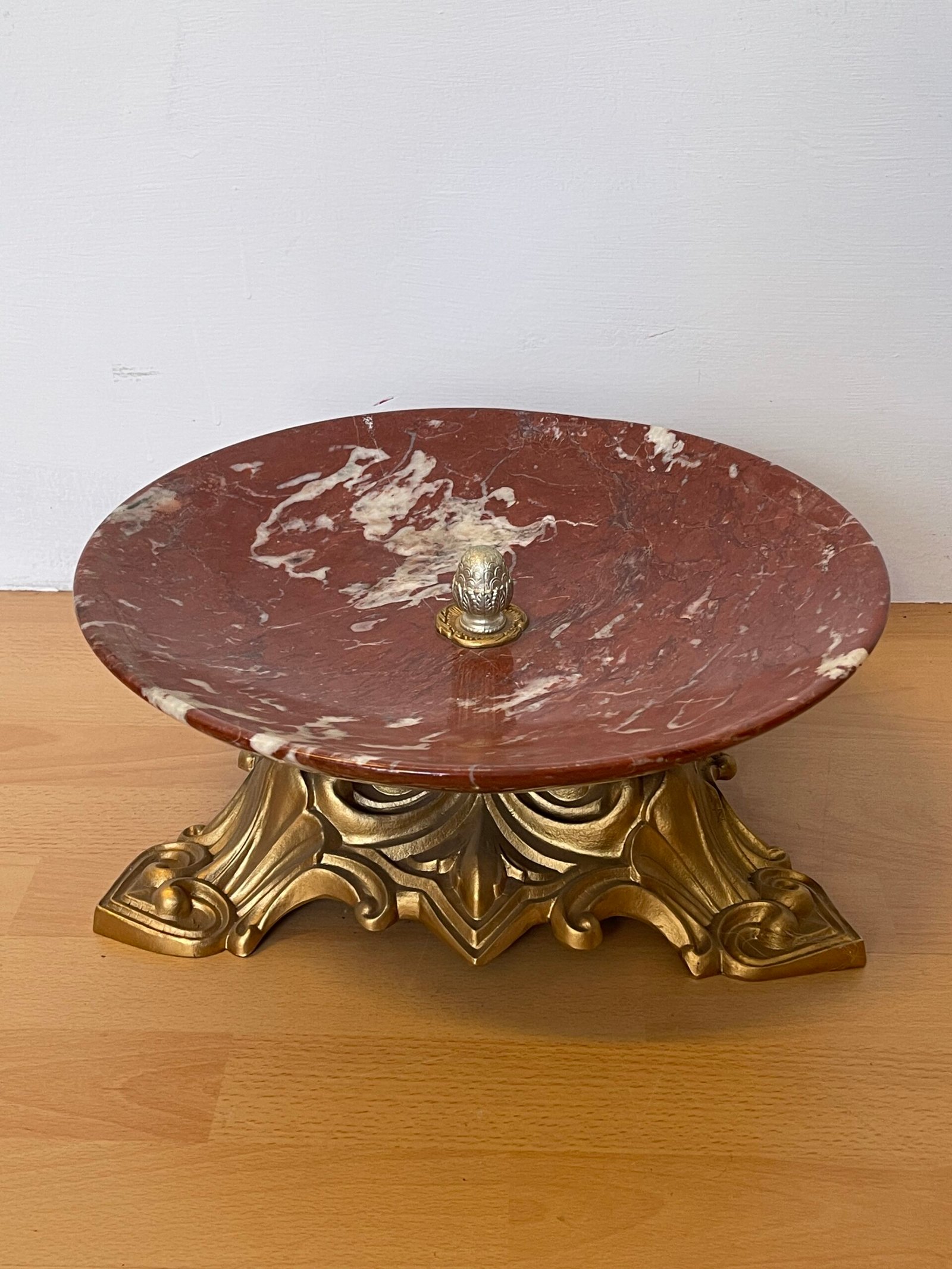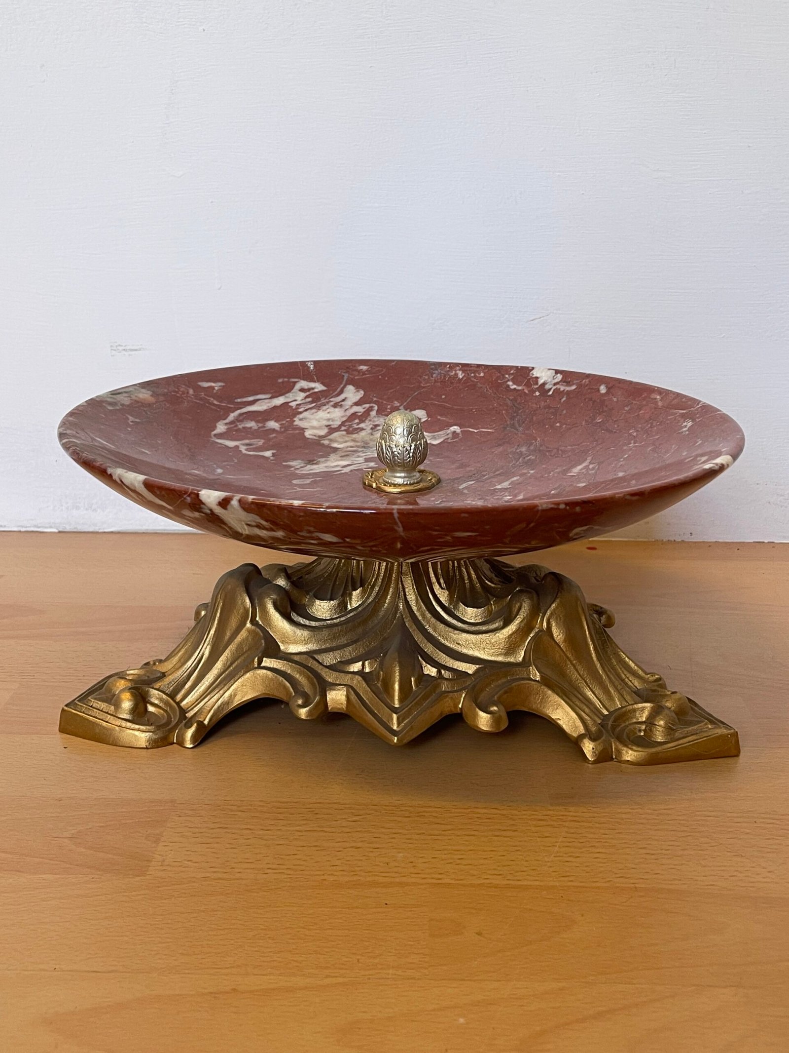 Magnifico piatto da centro in marmo rosso venato, posizionato su una base elegante e finemente lavorata in bronzo dorato. Il piatto, con il suo design ampio e concavo, è perfetto per esporre frutta, fiori o oggetti decorativi, aggiungendo un tocco di lusso e raffinatezza a qualsiasi ambiente. La base dorata, con dettagli floreali e curvi, conferisce solidità e un’eleganza senza tempo. Questo pezzo si presta bene a qualsiasi tipo di arredamento, dalla zona giorno alla sala da pranzo, ed è ideale per chi cerca un oggetto di grande impatto visivo.