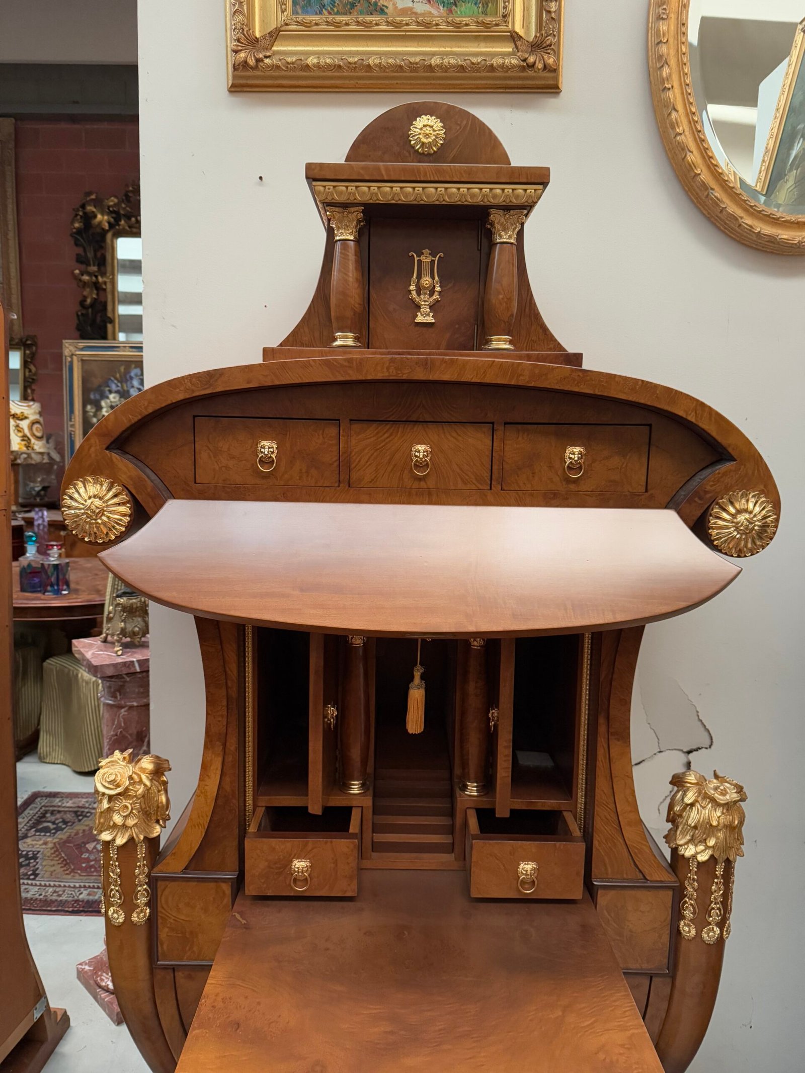 Imponente mobile a cifra (o a colonna) in stile Impero, caratterizzato da una sagoma a vaso rovesciato o a lira. Realizzato in legno pregiato, probabilmente radica o piuma di mogano, e riccamente adornato con bronzi dorati a cesello raffiguranti motivi classici come ghirlande, teste di leone, liri e fregi. La parte superiore presenta un frontone con colonne e un coronamento. Dispone di ante o cassetti celati, tipici della funzione di secretaire. Un pezzo di alta ebanisteria