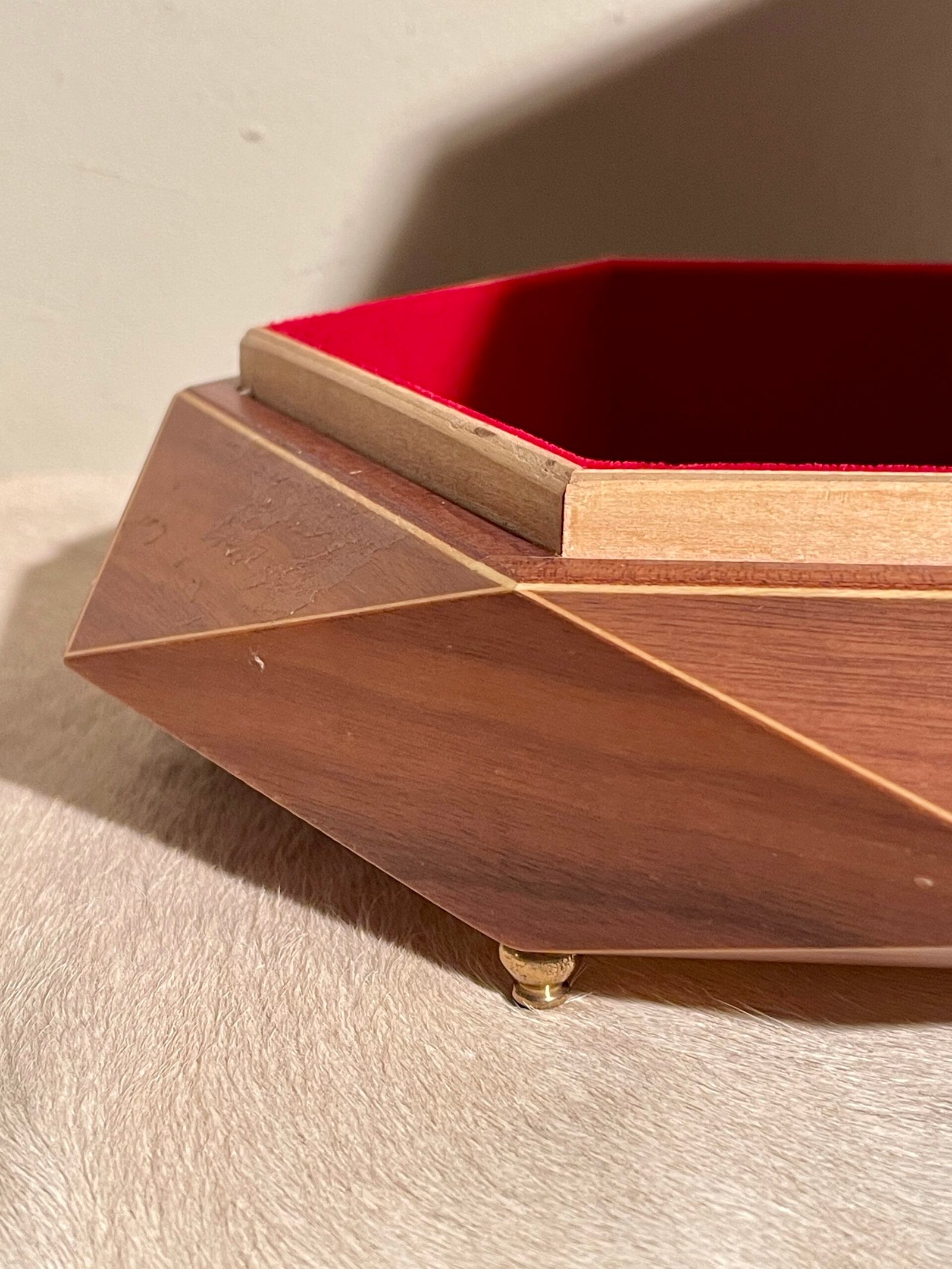 Materiali: legno con intarsio, velluto interno, piedini metallici