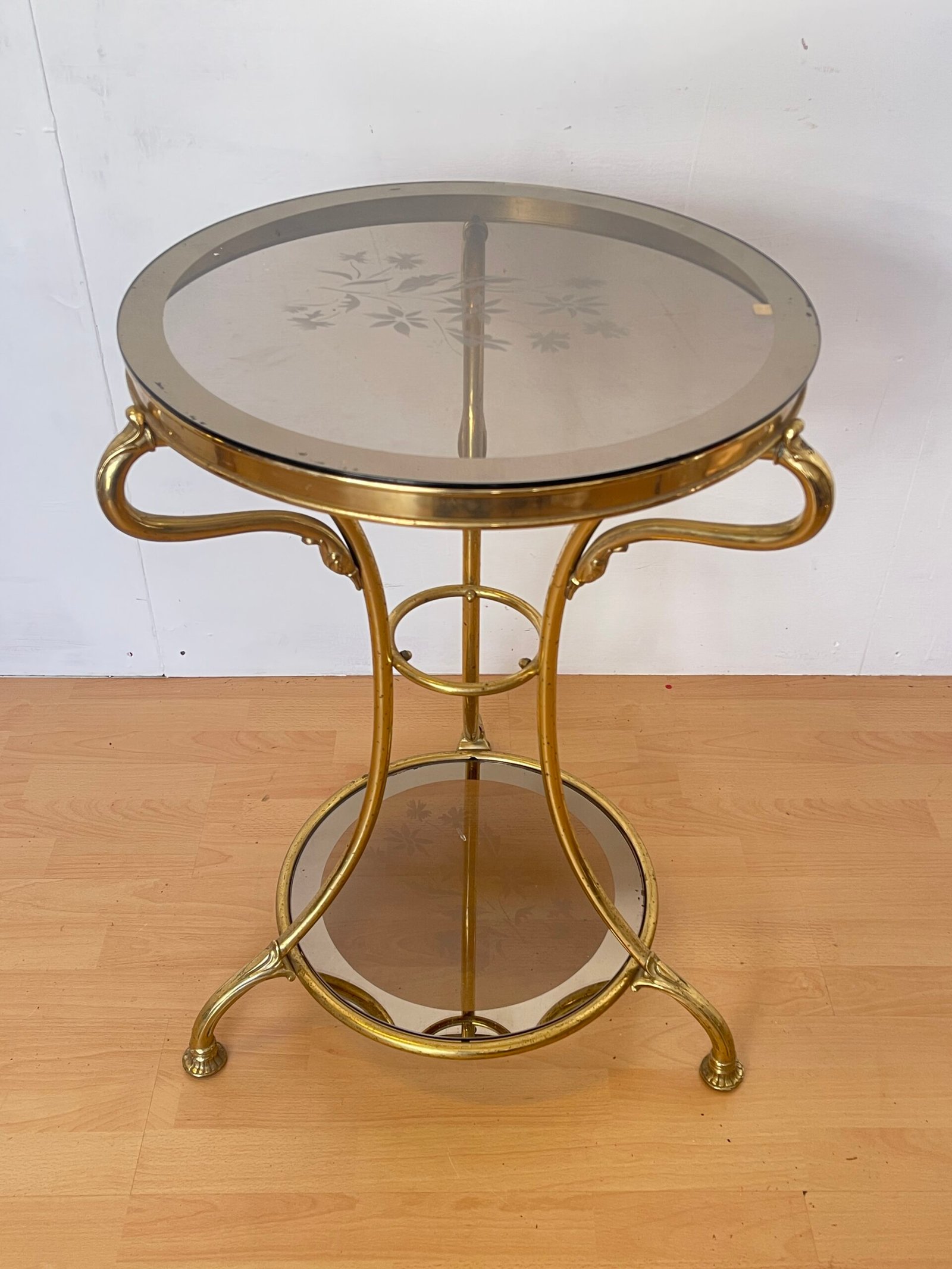 Raffinato tavolino vintage, caratterizzato da una base dorata curvata e un elegante piano in vetro decorato. Il vetro presenta un delicato motivo floreale inciso, creando un gioco di luci e riflessi che arricchisce l’ambiente. Il design sofisticato e le finiture dorate lo rendono perfetto per ambienti classici, salotti o ingressi. Il tavolino è ideale per essere utilizzato come supporto per oggetti decorativi, libri o piccole piante, combinando bellezza e funzionalità in un unico pezzo.