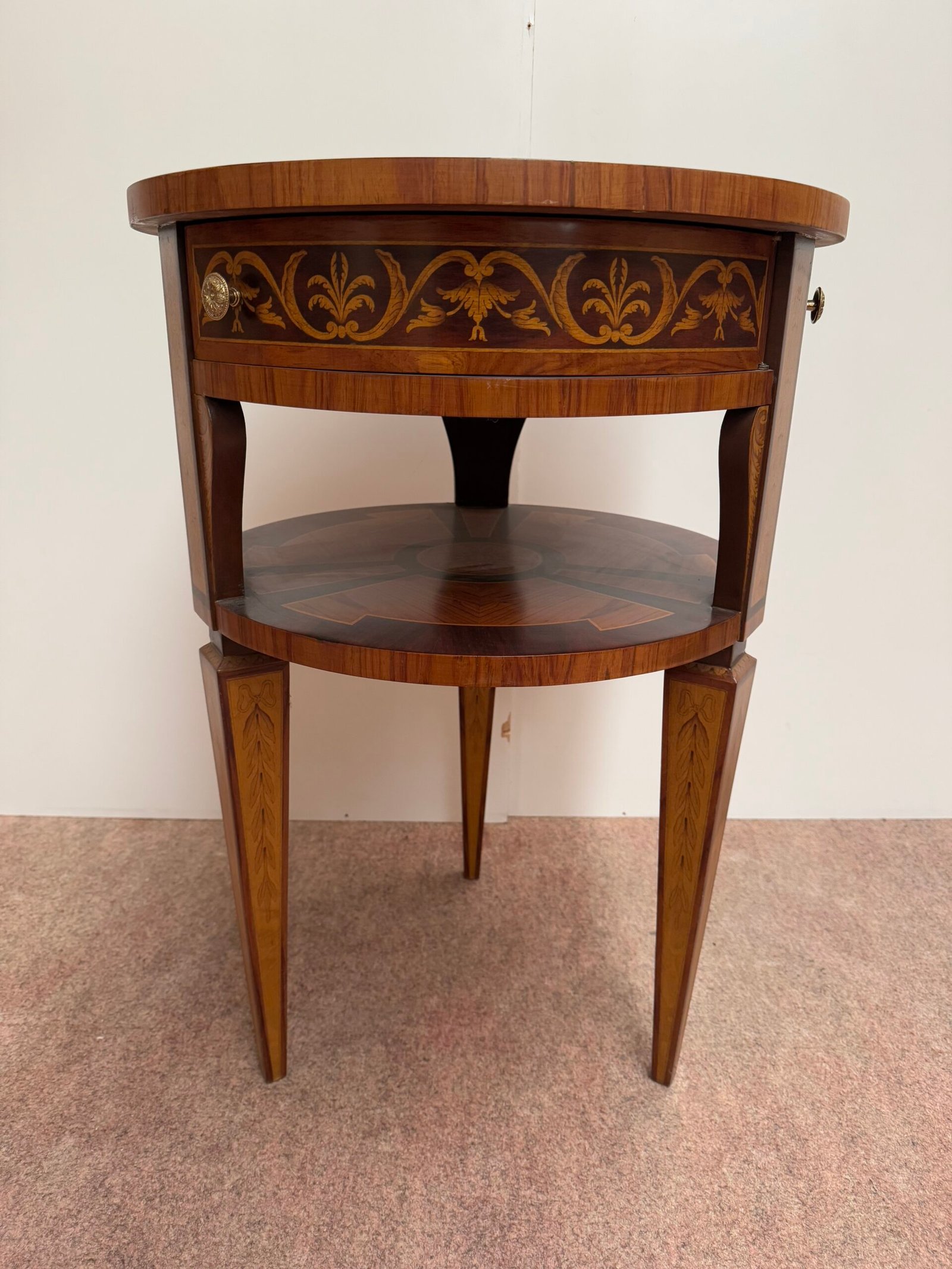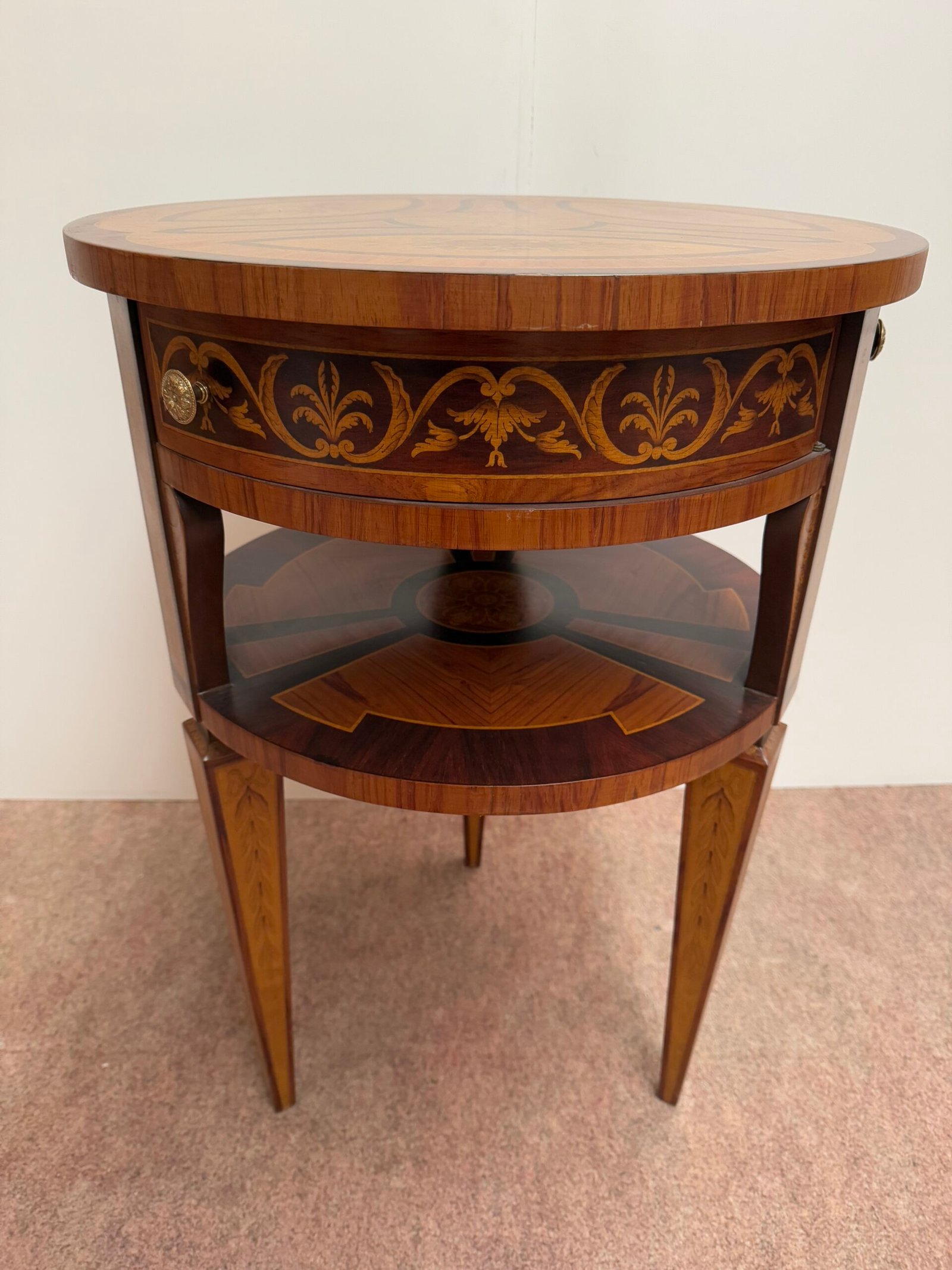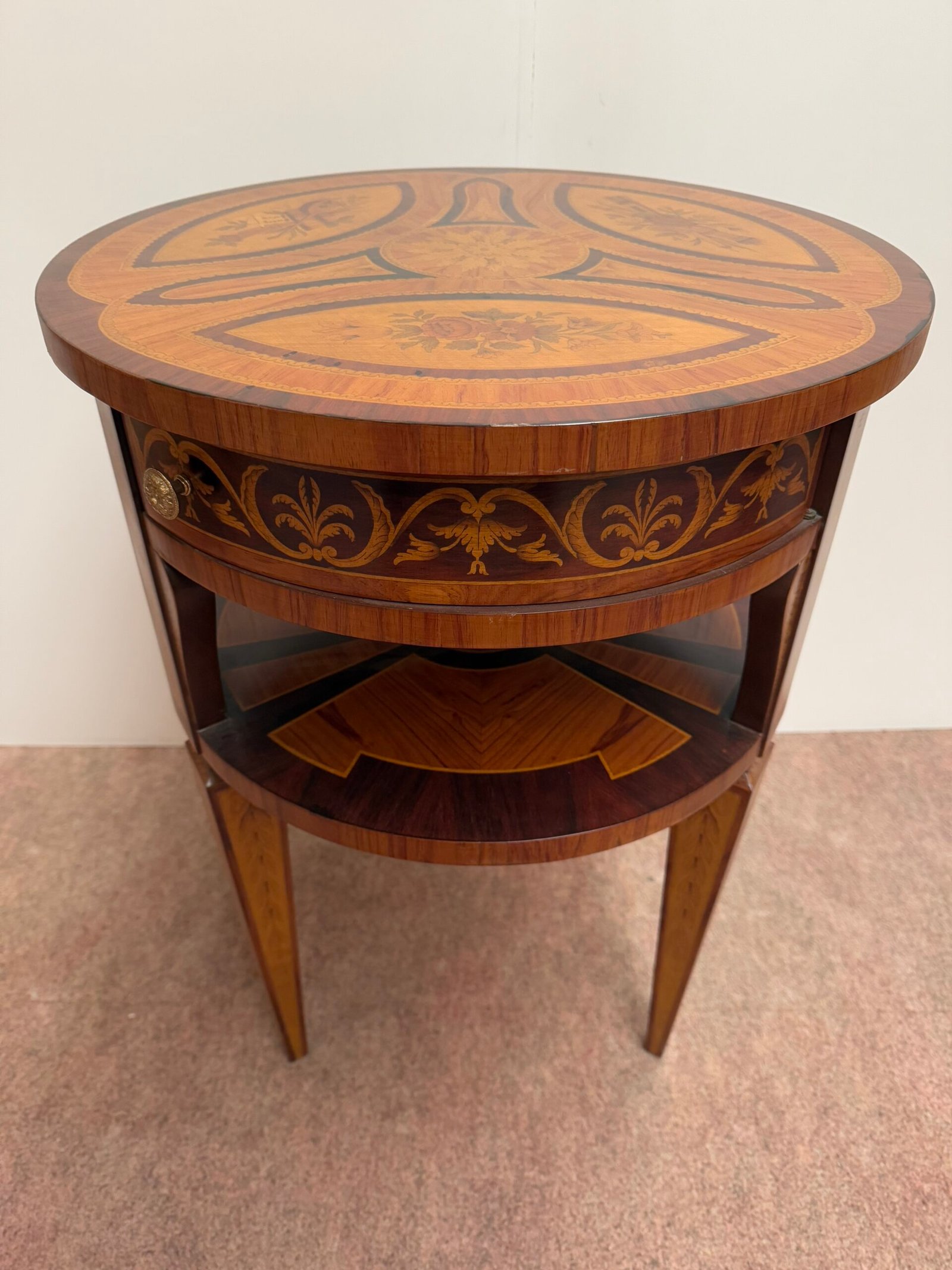Tavolino rotondo in stile classico con intarsi floreali – Eleganza Senza Tempo