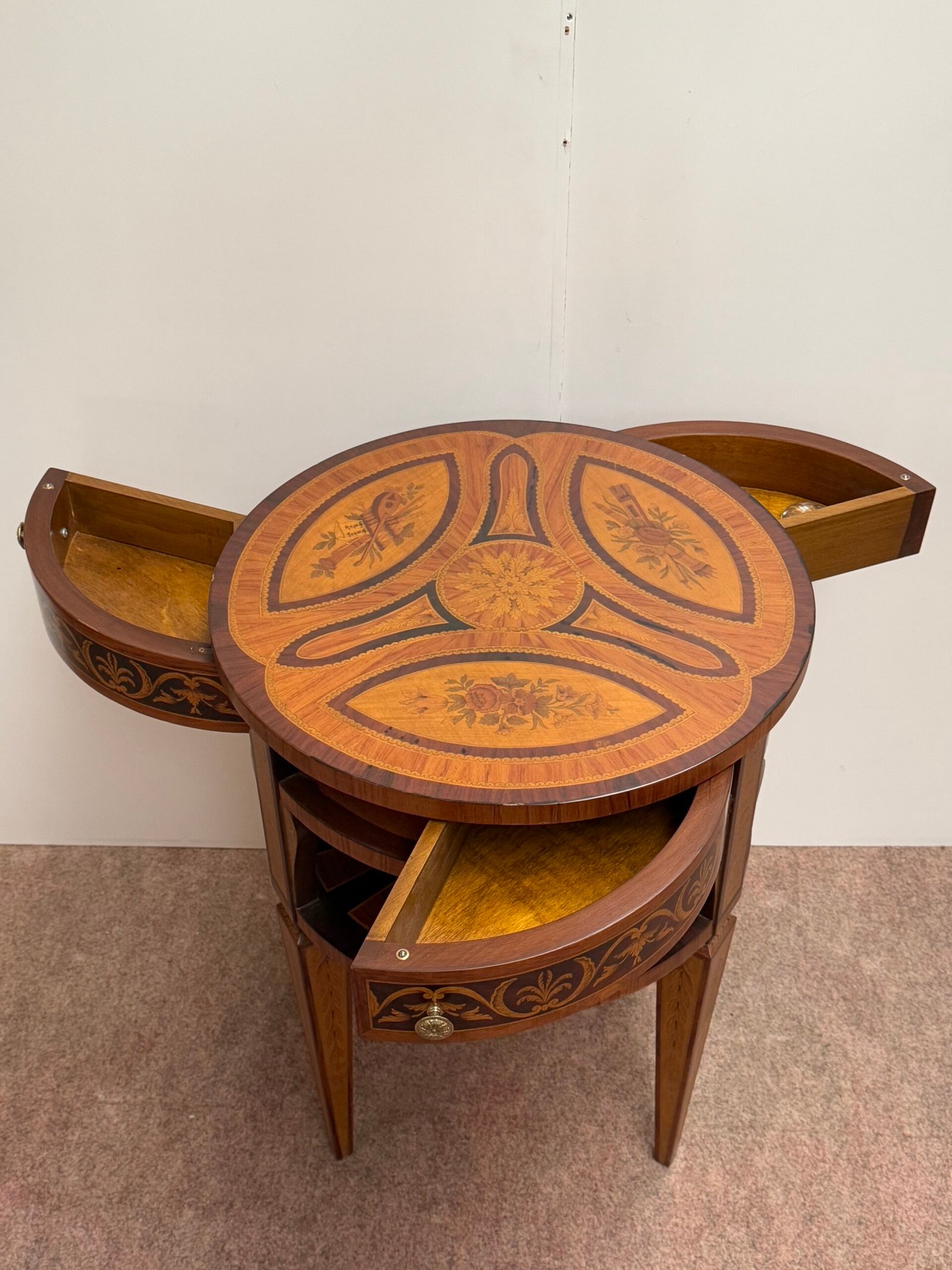 Splendido tavolino rotondo finemente intarsiato, ideale come complemento d’arredo raffinato per salotti, camere o ingressi. Realizzato con maestria artigianale, questo pezzo unico coniuga estetica classica e funzionalità moderna.