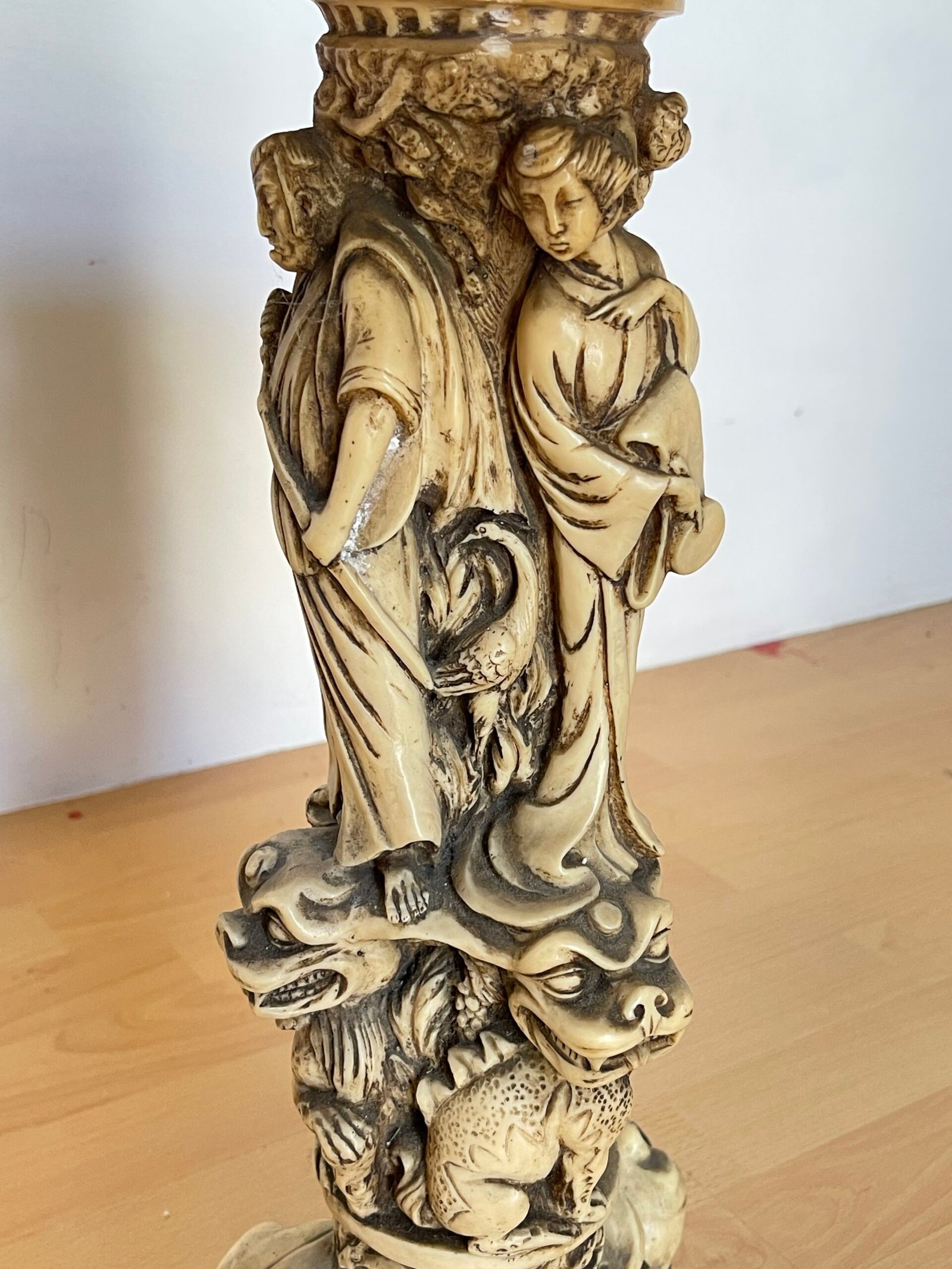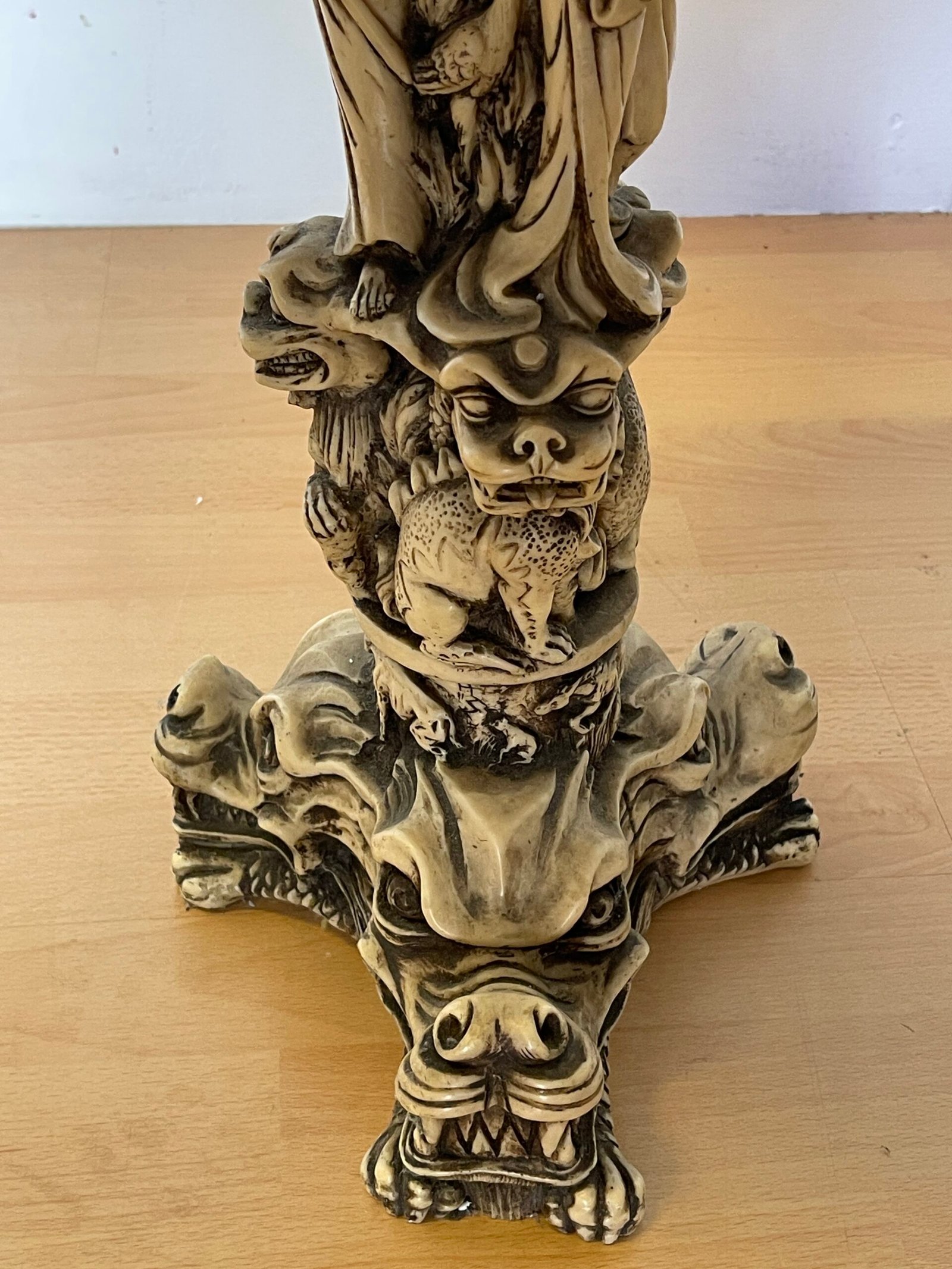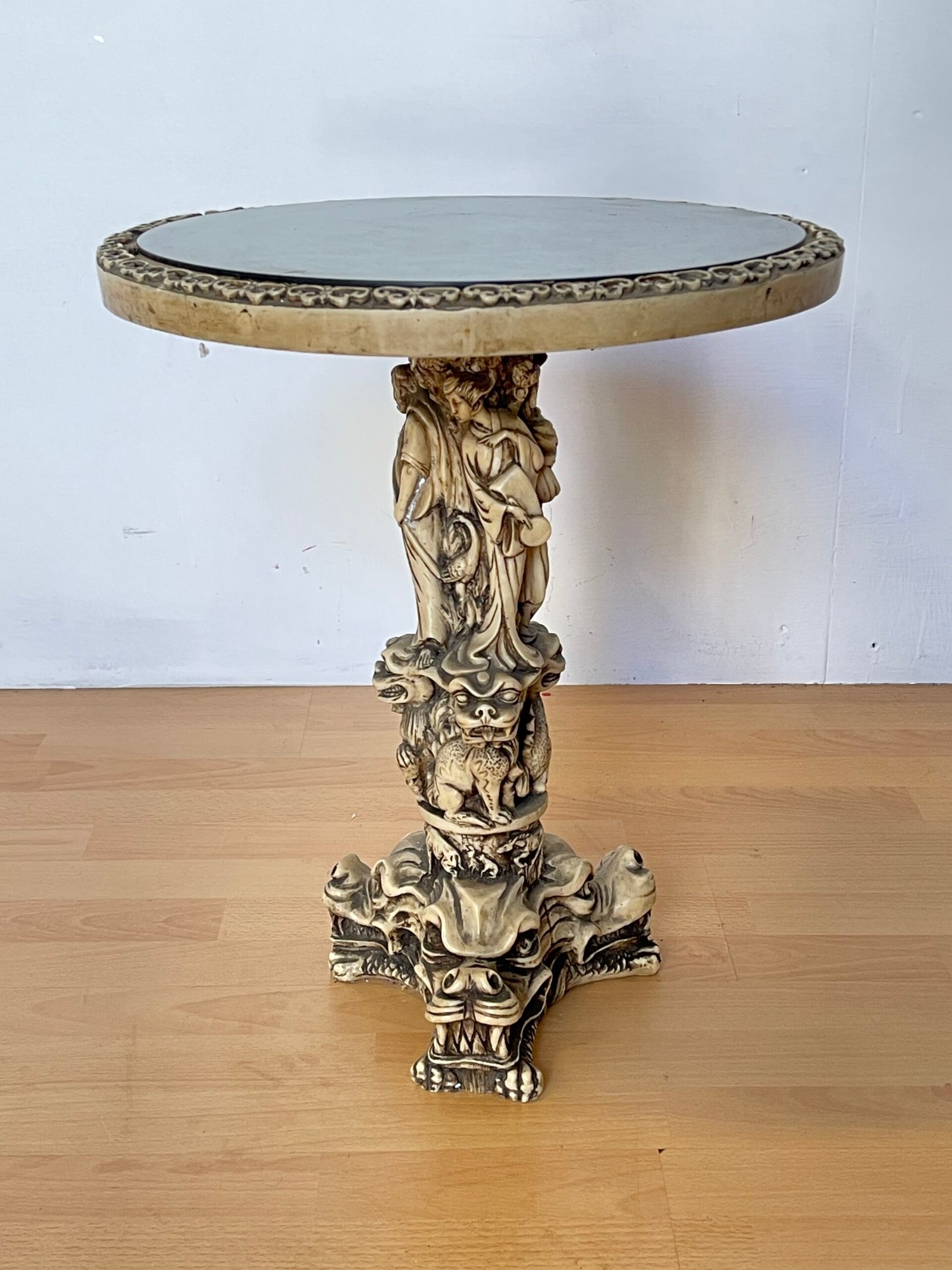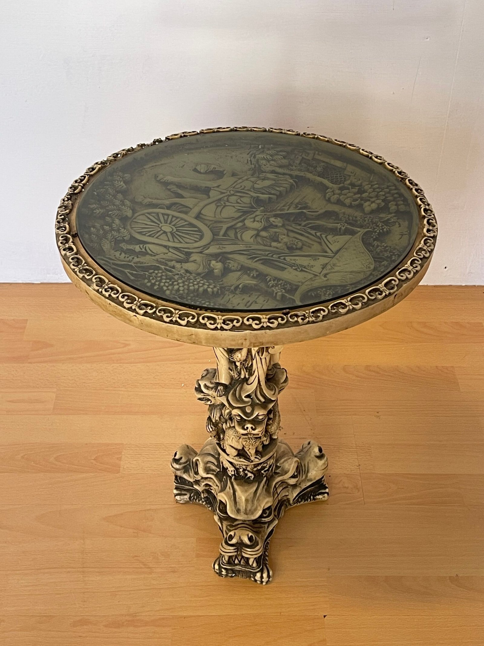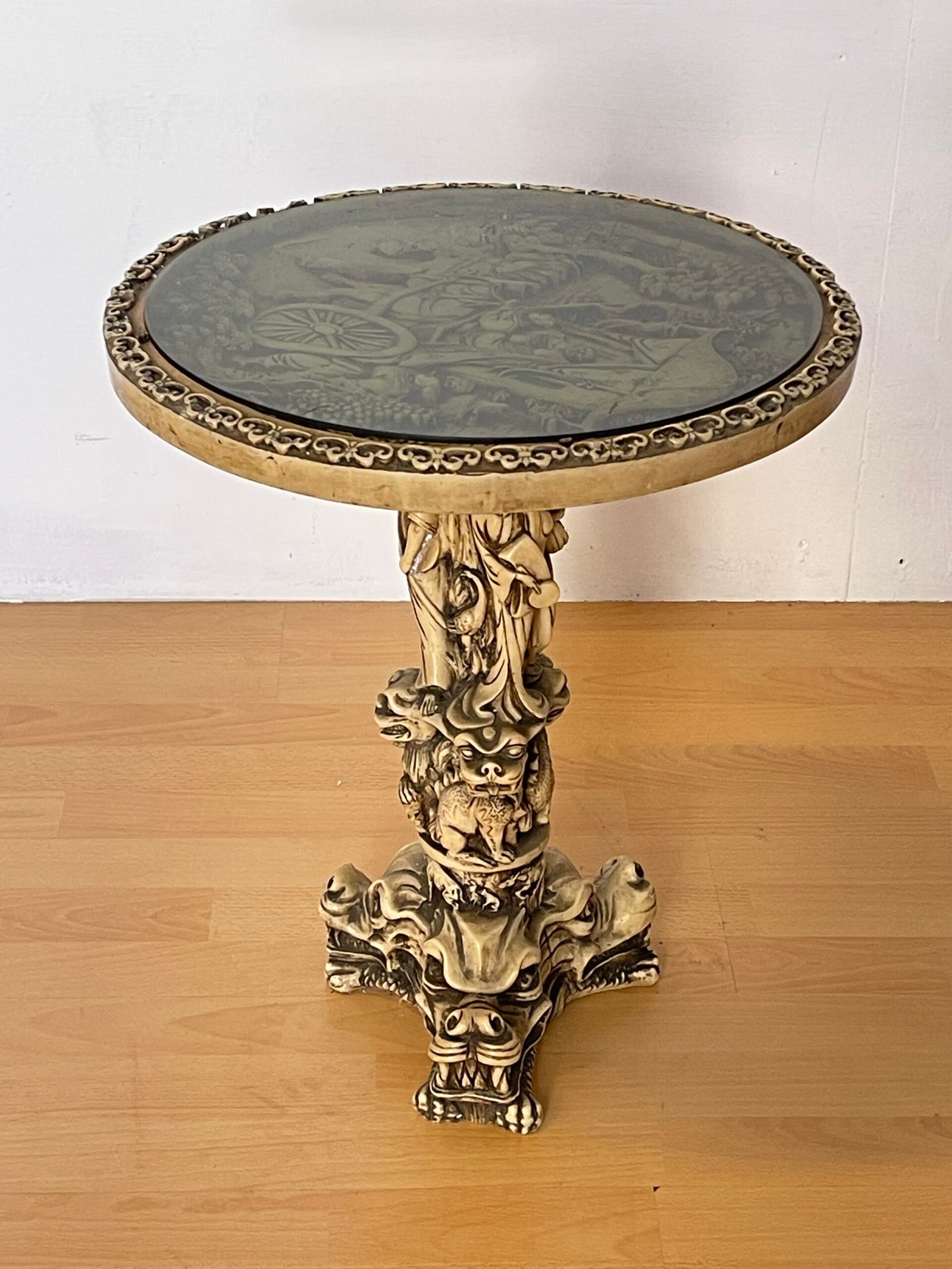 Affascinante tavolino decorativo dal forte impatto scenografico, caratterizzato da una base scultorea riccamente lavorata con motivi di draghi e figure mitologiche. La struttura, dal tono avorio anticato, presenta dettagli finemente scolpiti che richiamano uno stile orientale e fantasy, rendendolo un pezzo unico e di grande personalità.